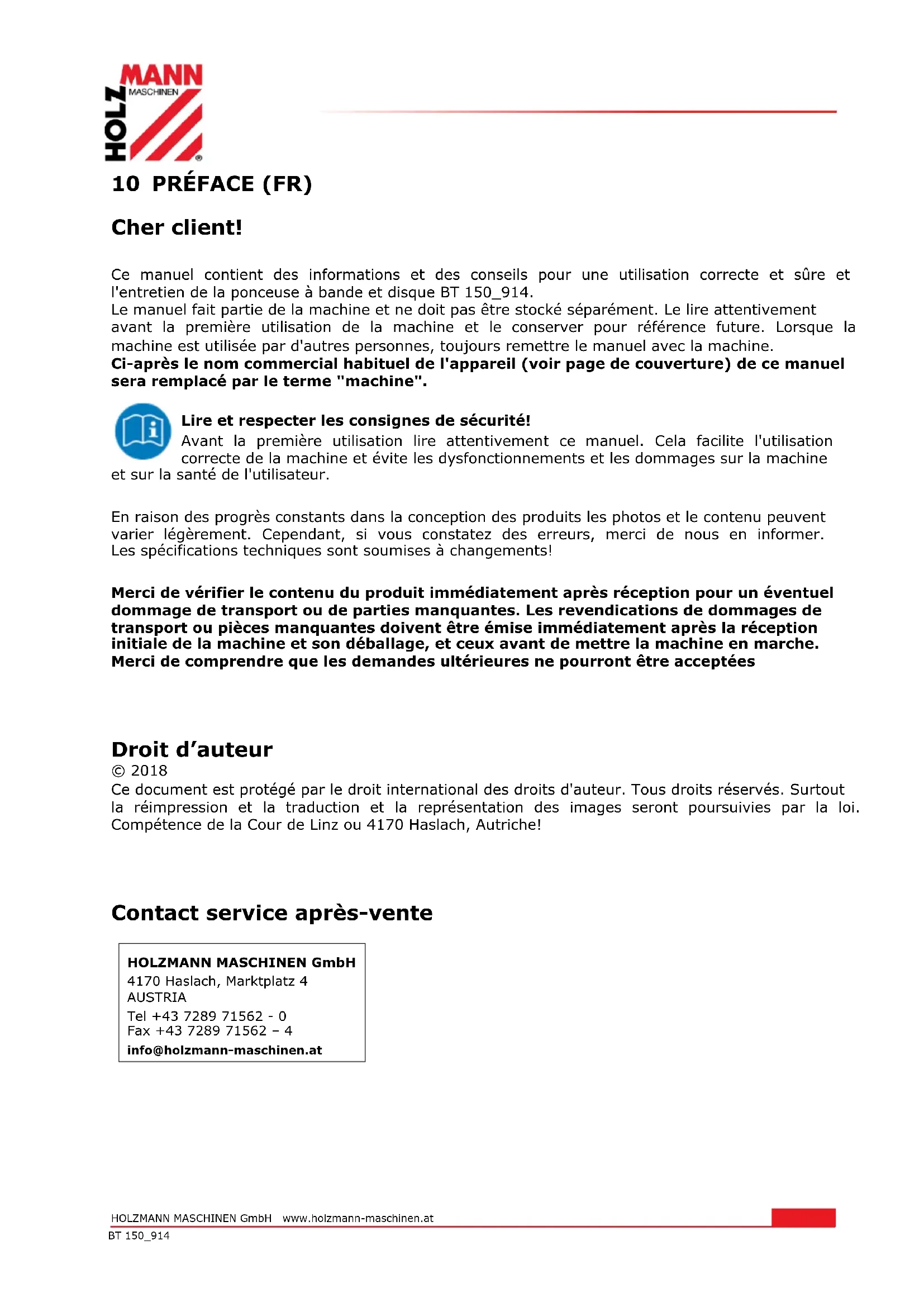 - Druck reduzierenHOLZMANN MASCHINEN GmbH www.holzmann-maschinen.at 17 BT 150_914 10 PRÉFACE (FR) Cher client! Ce manuel contient des informations et des conseils pour une utilisation correcte et sûre et l'entretien de la ponceuse à bande et disque BT 150_914. Le manuel fait partie de la machine et ne doit pas être stocké séparément. Le lire attentivement avant la première utilisation de la machine et le conserver pour référence future. Lorsque la machine est utilisée par d'autres personnes, toujours remettre le manuel avec la machine. Ci-après le nom commercial habituel de l'appareil (voir page de couverture) de ce manuel sera remplacé par le terme "machine". Lire et respecter les consignes de sécurité! Avant la première utilisation lire attentivement ce manuel. Cela facilite l'utilisation correcte de la machine et évite les dysfonctionnements et les dommages sur la machine et sur la santé de l'utilisateur. En raison des progrès constants dans la conception des produits les photos et le contenu peuvent varier légèrement. Cependant, si vous constatez des erreurs, merci de nous en informer. Les spécifications techniques sont soumises à changements! Merci de vérifier le contenu du produit immédiatement après réception pour un éventuel dommage de transport ou de parties manquantes. Les revendications de dommages de transport ou pièces manquantes doivent être émise immédiatement après la réception initiale de la machine et son déballage, et ceux avant de mettre la machine en marche. Merci de comprendre que les demandes ultérieures ne pourront être acceptées