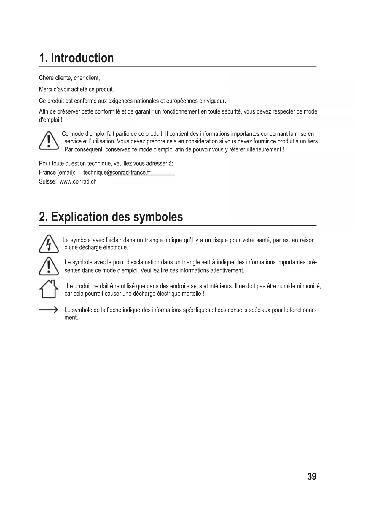 Chèrecliente,cherclient, Merci d’avoir acheté ce produit. Ce produit est conforme aux exigences nationales et européennes en vigueur. Andepréservercetteconformitéetdegarantirunfonctionnemententoutesécurité,vousdevezrespectercemode d’emploi ! Ce mode d’emploi fait partie de ce produit. Il contient des informations importantes concernant la mise en serviceetl'utilisation.Vousdevezprendrecelaenconsidérationsivousdevezfournirceproduitàuntiers. Parconséquent,conservezcemoded'emploiandepouvoirvousyréférerultérieurement! Pour toute question technique, veuillez vous adresser à: France(email): technique@conrad-france.fr Suisse: www.conrad.ch
