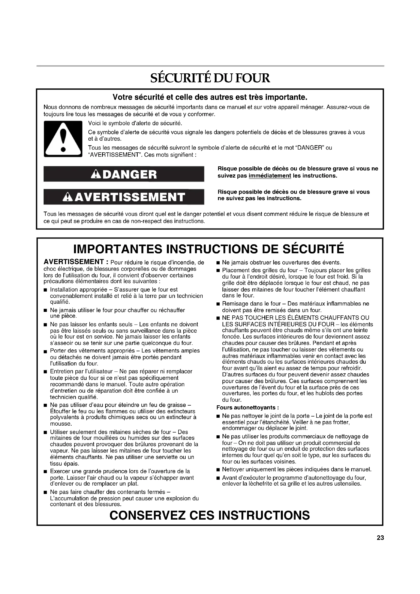 AVERTISSEMENT : Pour réduire le risque d’incendie, de choc électrique, de blessures corporelles ou de dommages lors de l’utilisation du four, il convient d’observer certaines précautions élémentaires dont les suivantes : Installation appropriée – S’assurer que le four est convenablement installé et relié à la terre par un technicien qualifié. Ne jamais utiliser le four pour chauffer ou réchauffer une pièce. Ne pas laisser les enfants seuls – Les enfants ne doivent pas être laissés seuls ou sans surveillance dans la pièce où le four est en service. Ne jamais laisser les enfants s’asseoir ou se tenir sur une partie quelconque du four. Porter des vêtements appropriés – Les vêtements amples ou détachés ne doivent jamais être portés pendant l’utilisation du four. Entretien par l’utilisateur – Ne pas réparer ni remplacer toute pièce du four si ce n’est pas spécifiquement recommandé dans le manuel. Toute autre opération d’entretien ou de réparation doit être confiée à un technicien qualifié. Ne pas utiliser d’eau pour éteindre un feu de graisse – Étouffer le feu ou les flammes ou utiliser des extincteurs polyvalents à produits chimiques secs ou un extincteur à mousse. Utiliser seulement des mitaines sèches de four – Des mitaines de four mouillées ou humides sur des surfaces chaudes peuvent provoquer des brûlures provenant de la vapeur. Ne pas laisser les mitaines de four toucher les éléments chauffants. Ne pas utiliser une serviette ou un tissu épais. Exercer une grande prudence lors de l’ouverture de la porte. Laisser l’air chaud ou la vapeur s’échapper avant d’enlever ou de remplacer un plat. Ne pas faire chauffer des contenants fermés – L’accumulation de pression peut causer une explosion du contenant et des blessures. Ne jamais obstruer les ouvertures des évents. Placement des grilles du four – Toujours placer les grilles du four à l’endroit désiré, lorsque le four est froid. Si la grille doit être déplacée lorsque le four est chaud, ne pas laisser des mitaines de four toucher l’élément chauffant dans le four. Remisage dans le four – Des matériaux inflammables ne doivent pas être remisés dans un four. NE PAS TOUCHER LES ÉLÉMENTS CHAUFFANTS OU LES SURFACES INTÉRIEURES DU FOUR – les éléments chauffants peuvent être chauds même s’ils ont une teinte foncée. Les surfaces intérieures de four deviennent assez chaudes pour causer des brûlures. Pendant et après l’utilisation, ne pas toucher ou laisser des vêtements ou autres matériaux inflammables venir en contact avec les éléments chauds ou les surfaces intérieures chaudes du four avant qu’ils aient eu assez de temps pour refroidir. D’autres surfaces du four peuvent devenir assez chaudes pour causer des brûlures. Ces surfaces comprennent les ouvertures de l’évent du four et la surface près de ces ouvertures, les portes du four, et les hublots des portes du four.Fours autonettoyants : Ne pas nettoyer le joint de la porte – Le joint de la porte est essentiel pour l’étanchéité. Veiller à ne pas frotter, endommager ou déplacer le joint. Ne pas utiliser les produits commerciaux de nettoyage de four – On ne doit pas utiliser un produit commercial de nettoyage de four ou un enduit de protection des surfaces internes du four quel qu’en soit le type, sur les surfaces du four ou les surfaces voisines. Nettoyer uniquement les pièces indiquées dans le manuel. Avant d’exécuter le programme d’autonettoyage du four, enlever la lèchefrite et sa grille et les autres ustensiles.24