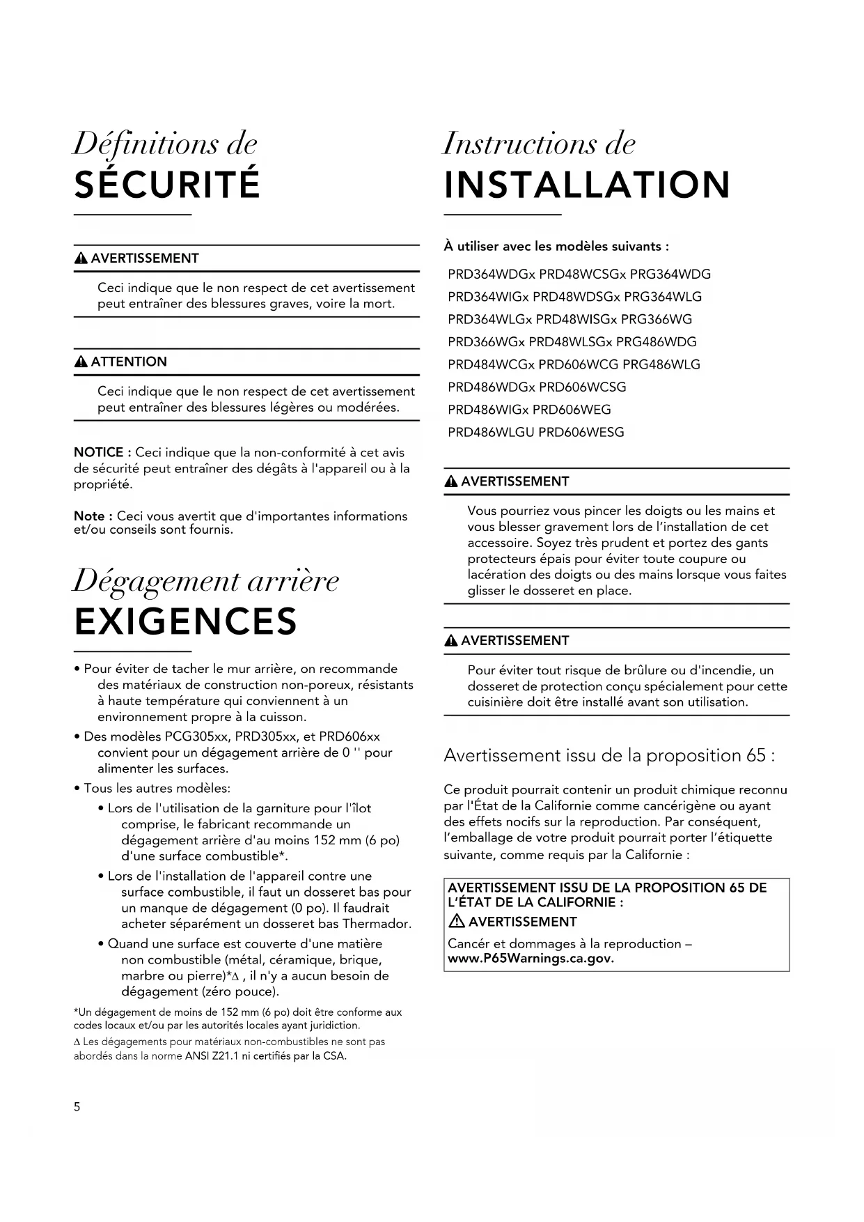 - Quand une surface est couverte d'une matière non combustible (métal, céramique, brique, marbre ou pierre)* , il n'y a aucun besoin de dégagement (zéro pouce). *Un dégagement de moins de 152 mm (6 po) doit être conforme aux codes locaux et/ou par les autorités locales ayant juridiction. Les dégagements pour matériaux non-combustibles ne sont pas abordés dans la norme ANSI Z21.1 ni certifiés par la CSA. Instructions de INSTALLATION À utiliser avec les modèles suivants : 9 AVERTISSEMENT Vous pourriez vous pincer les doigts ou les mains et vous blesser gravement lors de l’installation de cet accessoire. Soyez très prudent et portez des gants protecteurs épais pour éviter toute coupure ou lacération des doigts ou des mains lorsque vous faites glisser le dosseret en place. 9 AVERTISSEMENT Pour éviter tout risque de brûlure ou d'incendie, un dosseret de protection conçu spécialement pour cette cuisinière doit être installé avant son utilisation. Avertissement issu de la proposition 65 : Ce produit pourrait contenir un produit chimique reconnu par l'État de la Californie comme cancérigène ou ayant des effets nocifs sur la reproduction. Par conséquent, l’emballage de votre produit pourrait porter l’étiquette suivante, comme requis par la Californie : PRD364WDGx PRD48WCSGx PRG364WDG PRD364WIGx PRD48WDSGx PRG364WLG PRD364WLGx PRD48WISGx PRG366WG PRD366WGx PRD48WLSGx PRG486WDG PRD484WCGx PRD606WCG PRG486WLG PRD486WDGx PRD606WCSG PRD486WIGx PRD606WEG