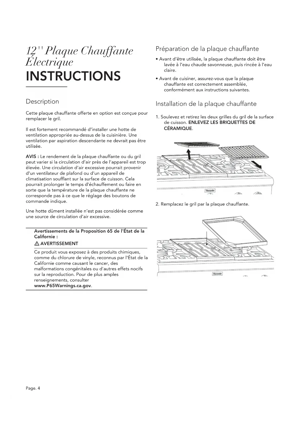 vinegar should be used to remove any oil layers from the previous seasoning process.Page. 4 12'' Plaque Chauffante Électrique INSTRUCTIONS Description Cette plaque chauffante offerte en option est conçue pour remplacer le gril. Il est fortement recommandé d’installer une hotte de ventilation appropriée au-dessus de la cuisinière. Une ventilation par aspiration descendante ne devrait pas être utilisée. AVIS : Le rendement de la plaque chauffante ou du gril peut varier si la circulation d’air près de l’appareil est trop élevée. Une circulation d’air excessive pourrait provenir d’un ventilateur de plafond ou d’un appareil de climatisation soufflant sur la surface de cuisson. Cela pourrait prolonger le temps d’échauffement ou faire en sorte que la température de la plaque chauffante ne corresponde pas à ce que le réglage des boutons de commande indique. Une hotte dûment installée n’est pas considérée comme une source de circulation d’air excessive. Avertissements de la Proposition 65 de l'État de la Californie : AVERTISSEMENT Ce produit vous exposez à des produits chimiques, comme du chlorure de vinyle, reconnus par l'État de la Californie comme causant le cancer, des malformations congénitales ou d'autres effets nocifs sur la reproduction. Pour de plus amples renseignements, consulter www.P65Warnings.ca.gov. Préparation de la plaque chauffante