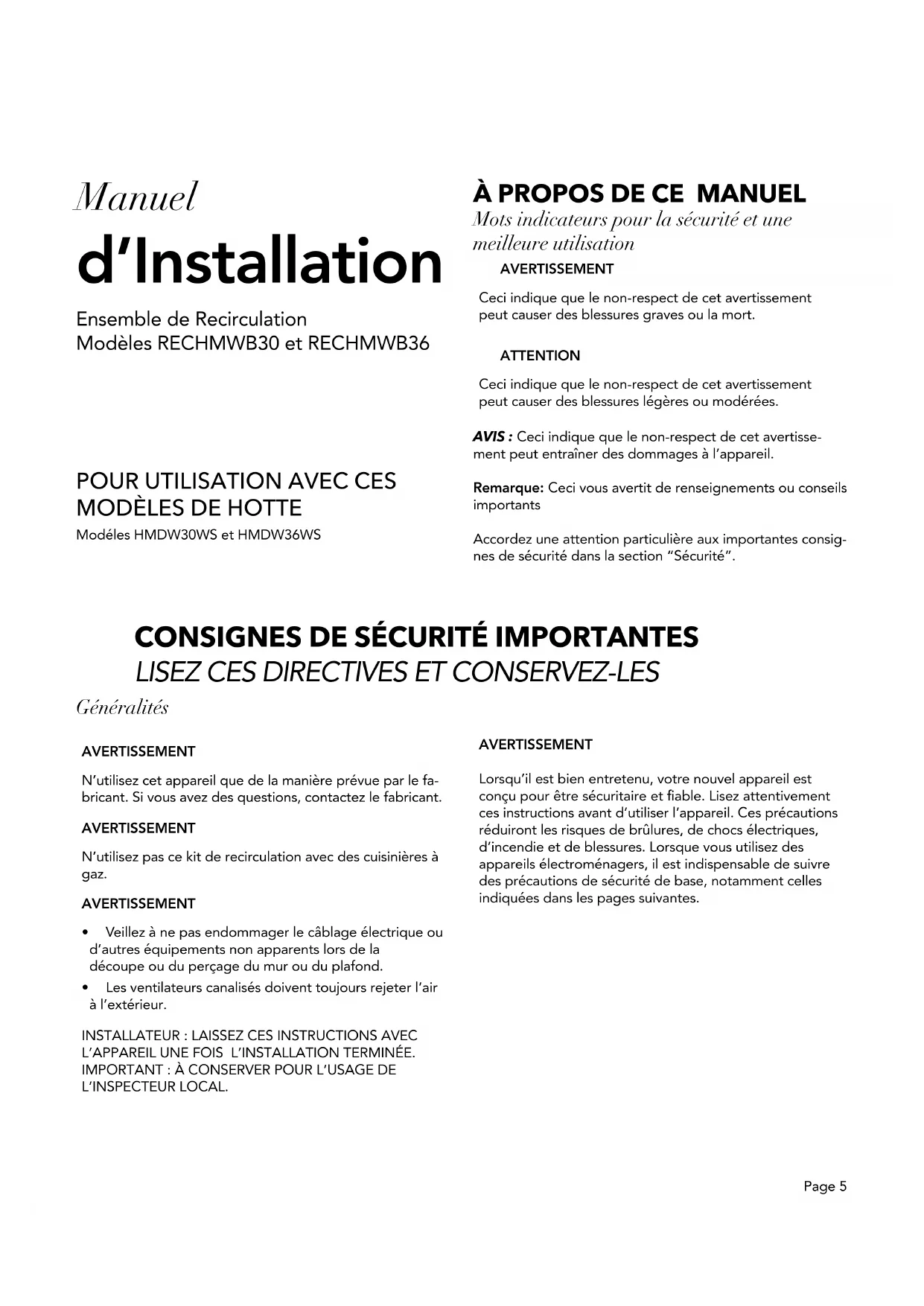 - Les ventilateurs canalisés doivent toujours rejeter l’air à l’extérieur.INSTALLATEUR : LAISSEZ CES INSTRUCTIONS AVEC L’APPAREIL UNE FOIS L’INSTALLATION TERMINÉE.IMPORTANT : À CONSERVER POUR L’USAGE DE L’INSPECTEUR LOCAL.AVERTISSEMENTLorsqu’il est bien entretenu, votre nouvel appareil est conçu pour être sécuritaire et able. Lisez attentivement ces instructions avant d’utiliser l’appareil. Ces précautions réduiront les risques de brûlures, de chocs électriques, d’incendie et de blessures. Lorsque vous utilisez des appareils électroménagers, il est indispensable de suivre des précautions de sécurité de base, notamment celles indiquées dans les pages suivantes.Page 6