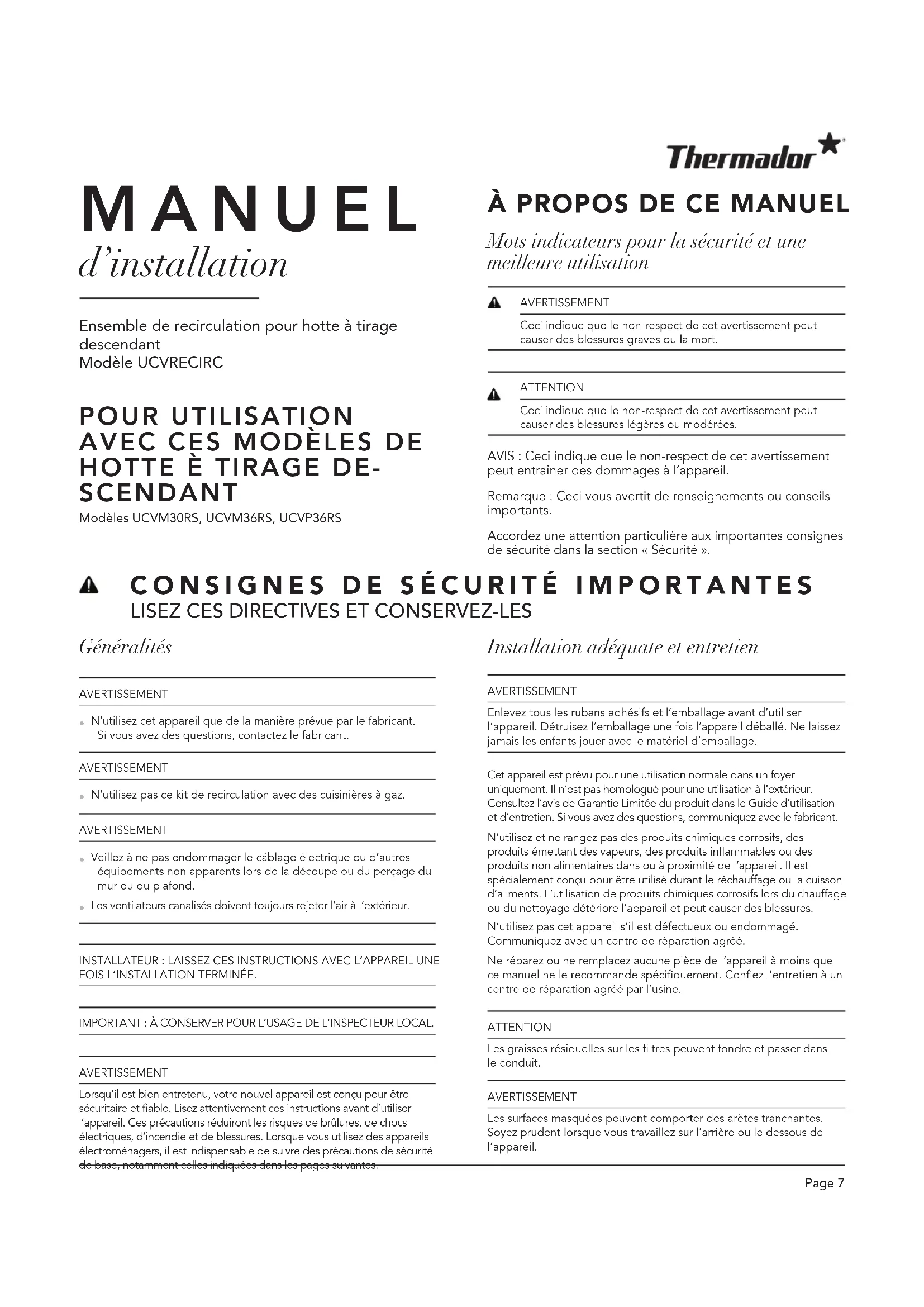 AVIS: Ceci indique que le non-respect de cet avertissement peut entraîner des dommages à l’appareil.Remarque: Ceci vous avertit de renseignements ou conseils importants.Accordez une attention particulière aux importantes consignes de sécurité dans la section «Sécurité». Ensemble de recirculation pour hotte à tirage descendant Modèle UCVRECIRC MANUEL d’installation POUR UTILISATION