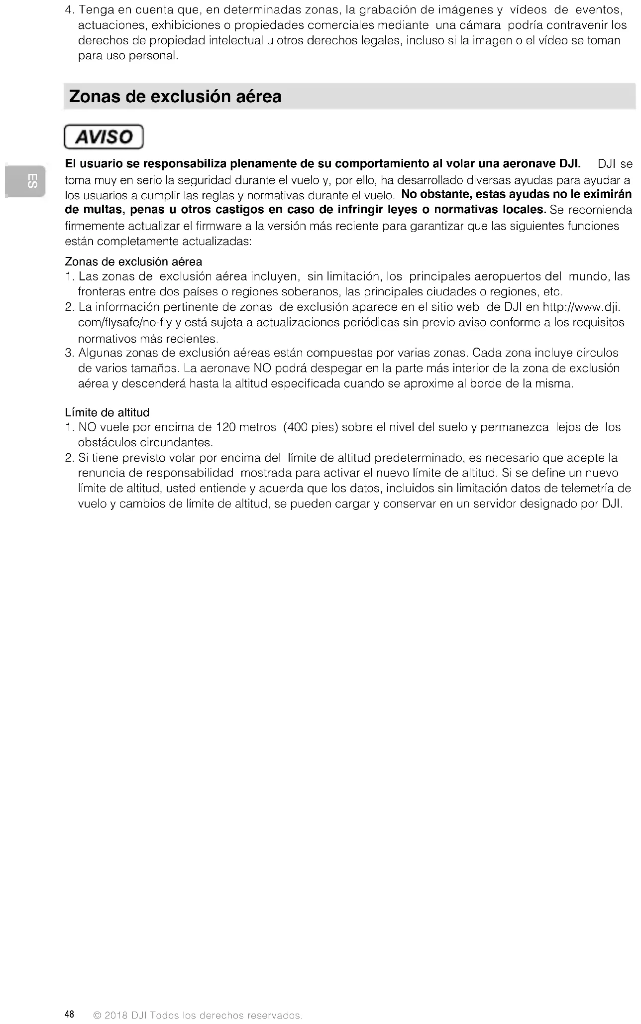 Les zones d'exclusion aérienne indiquées par DJI ne se substituent en aucun cas aux réglementations gouvernementales locales ou au bon sens dont doit faire preuve l'utilisateur. Ne volez PAS au-dessus des altitudes maximales dénies par vos lois et régulations locales.• Évitez de faire voler l'appareil dans des zones où des équipes de secours utilisent activement l'espace aérien Signal GPS fort Garder l'appareil en vue Voler en dessous de 120 m (400 pieds)Évitez de faire voler l'appareil au-dessus ou à proximité d'obstacles, de rassemblements de personnes, de lignes électriques à haute tension, d'arbres ou d'étendues d'eau.Ne faites PAS voler l'appareil à proximité de sources électromagnétiques puissantes, telles que des lignes électriques ou des postes de distribution, qui risquent d'affecter le compas intégré. N'utilisez PAS l'appareil dans de mauvaises conditions météorologiques (pluie, neige, brouillard, rafales dont la vitesse dépasse 10 m/s ou 35 km/h [22 mph], etc.).Tenez-vous à distance des hélices et des moteurs en rotation.Zone d'exclusion aériennePour en savoir plus, rendez-vous sur le site :http://www.dji.com/ysafeFaire voler l'appareil dans des espaces ouverts 120m ≥10 m/s 120 m ≥10 m/sFR © 2018 DJI Tous droits réservés.