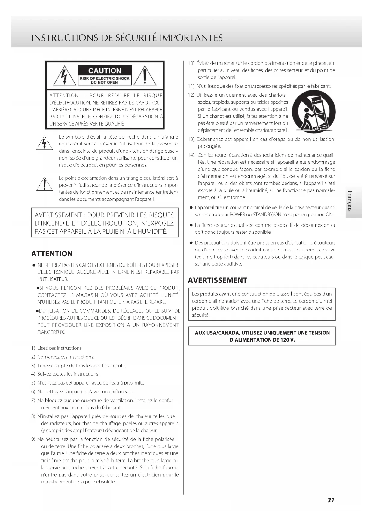 ATTENTION : POUR RÉDUIRE LE RISQUE D’ÉLECTROCUTION, NE RETIREZ PAS LE CAPOT (OU L’ARRIÈRE). AUCUNE PIÈCE INTERNE N’EST RÉPARABLE PAR L’UTILISATEUR. CONFIEZ TOUTE RÉPARATION À UN SERVICE APRÈS-VENTE QUALIFIÉ. Le symbole d’éclair à tête de flèche dans un triangle équilatéral sert à prévenir l’utilisateur de la présence dans l’enceinte du produit d’une «tension dangereuse» non isolée d’une grandeur suffisante pour constituer un risque d’électrocution pour les personnes. Le point d’exclamation dans un triangle équilatéral sert à prévenir l’utilisateur de la présence d’instructions impor-tantes de fonctionnement et de maintenance (entretien) dans les documents accompagnant l’appareil.