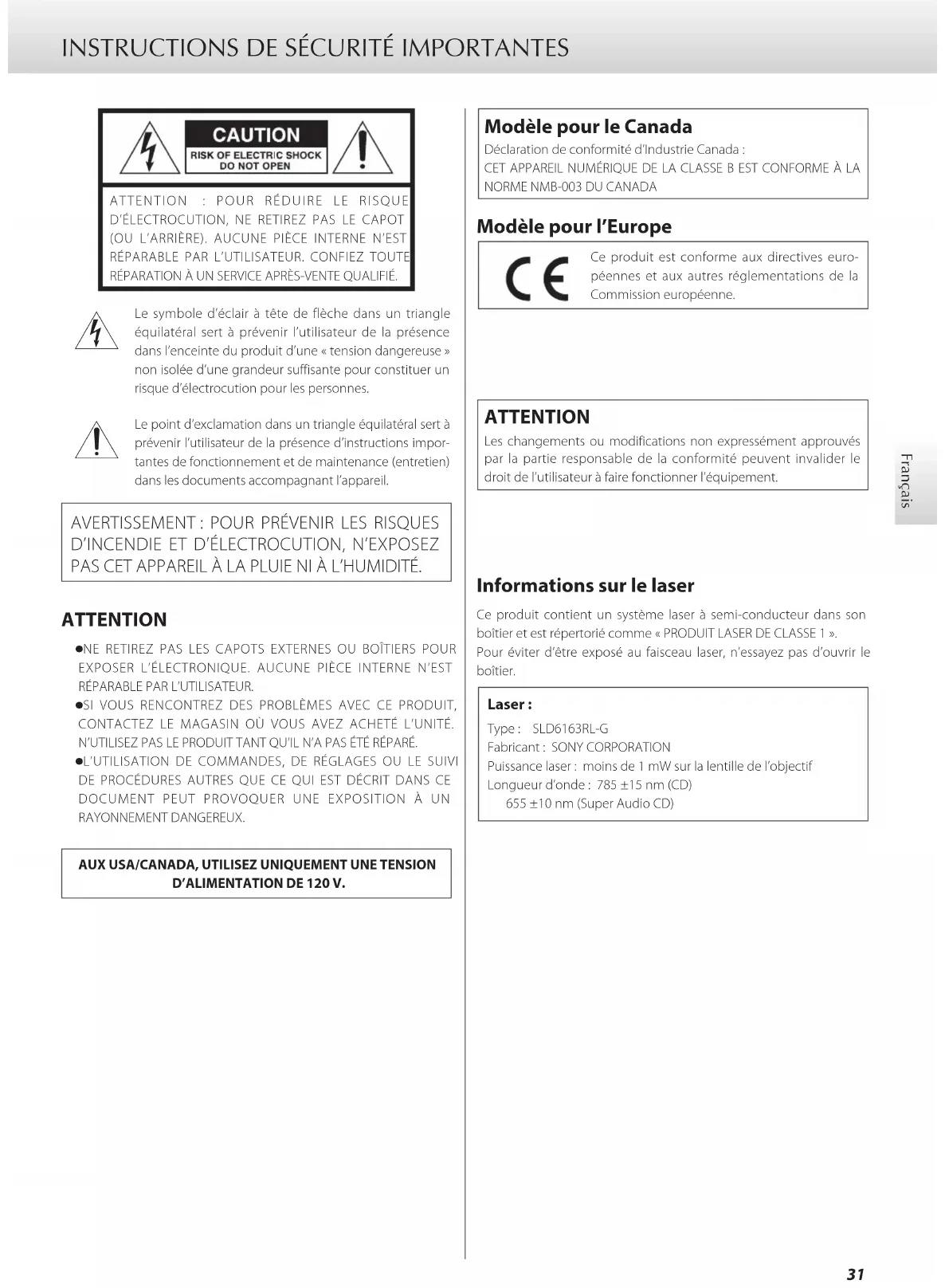 D’INCENDIE ET D’ÉLECTROCUTION, N’EXPOSEZ PAS CET APPAREIL À LA PLUIE NI À L’HUMIDITÉ. ATTENTION o NE RETIREZ PAS LES CAPOTS EXTERNES OU BOÎTIERS POUR EXPOSER L’ÉLECTRONIQUE. AUCUNE PIÈCE INTERNE N’EST RÉPARABLE PAR L’UTILISATEUR. o SI VOUS RENCONTREZ DES PROBLÈMES AVEC CE PRODUIT, CONTACTEZ LE MAGASIN OÙ VOUS AVEZ ACHETÉ L’UNITÉ. N’UTILISEZ PAS LE PRODUIT TANT QU’IL N’A PAS ÉTÉ RÉPARÉ. o L’UTILISATION DE COMMANDES, DE RÉGLAGES OU LE SUIVI DE PROCÉDURES AUTRES QUE CE QUI EST DÉCRIT DANS CE DOCUMENT PEUT PROVOQUER UNE EXPOSITION À UN RAYONNEMENT DANGEREUX.AUX USA/CANADA, UTILISEZ UNIQUEMENT UNE TENSION D’ALIMENTATION DE 120 V. Modèle pour le Canada Déclaration de conformité d’Industrie Canada :CET APPAREIL NUMÉRIQUE DE LA CLASSE B EST CONFORME À LA NORME NMB-003 DU CANADA Modèle pour l’Europe Ce produit est conforme aux directives euro-péennes et aux autres réglementations de la Commission européenne. ATTENTION Les changements ou modifications non expressément approuvés par la partie responsable de la conformité peuvent invalider le droit de l’utilisateur à faire fonctionner l’équipement. Informations sur le laser Ce produit contient un système laser à semi-conducteur dans son boîtier et est répertorié comme « PRODUIT LASER DE CLASSE 1 ». Pour éviter d’être exposé au faisceau laser, n’essayez pas d’ouvrir le boîtier.Laser : Type : SLD6163RL-GFabricant : SONY CORPORATIONPuissance laser : moins de 1 mW sur la lentille de l’objectifLongueur d’onde : 785 ±15 nm (CD) 655 ±10 nm (Super Audio CD)32 INSTRUCTIONS DE SÉCURITÉ IMPORTANTES (suite)