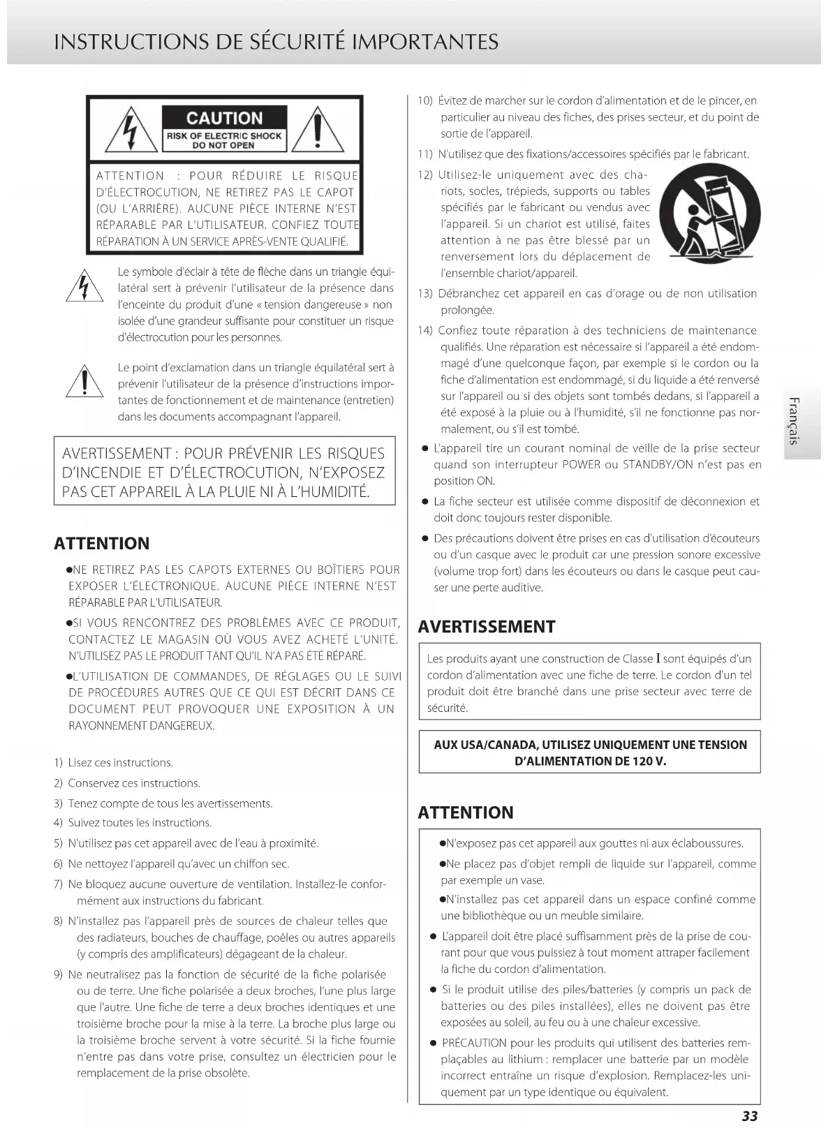 D’INCENDIE ET D’ÉLECTROCUTION, N’EXPOSEZ PAS CET APPAREIL À LA PLUIE NI À L’HUMIDITÉ. ATTENTION o NE RETIREZ PAS LES CAPOTS EXTERNES OU BOÎTIERS POUR EXPOSER L’ÉLECTRONIQUE. AUCUNE PIÈCE INTERNE N’EST RÉPARABLE PAR L’UTILISATEUR. o SI VOUS RENCONTREZ DES PROBLÈMES AVEC CE PRODUIT, CONTACTEZ LE MAGASIN OÙ VOUS AVEZ ACHETÉ L’UNITÉ. N’UTILISEZ PAS LE PRODUIT TANT QU’IL N’A PAS ÉTÉ RÉPARÉ. o L’UTILISATION DE COMMANDES, DE RÉGLAGES OU LE SUIVI DE PROCÉDURES AUTRES QUE CE QUI EST DÉCRIT DANS CE DOCUMENT PEUT PROVOQUER UNE EXPOSITION À UN RAYONNEMENT DANGEREUX.1) Lisez ces instructions.2) Conservez ces instructions.3) Tenez compte de tous les avertissements.4) Suivez toutes les instructions.5) N’utilisez pas cet appareil avec de l’eau à proximité.6) Ne nettoyez l’appareil qu’avec un chiffon sec.7) Ne bloquez aucune ouverture de ventilation. Installez-le confor-mément aux instructions du fabricant.8) N’installez pas l’appareil près de sources de chaleur telles que des radiateurs, bouches de chauffage, poêles ou autres appareils (y compris des amplificateurs) dégageant de la chaleur.9) Ne neutralisez pas la fonction de sécurité de la fiche polarisée ou de terre. Une fiche polarisée a deux broches, l’une plus large que l’autre. Une fiche de terre a deux broches identiques et une troisième broche pour la mise à la terre. La broche plus large ou la troisième broche servent à votre sécurité. Si la fiche fournie n’entre pas dans votre prise, consultez un électricien pour le remplacement de la prise obsolète.10) Évitez de marcher sur le cordon d’alimentation et de le pincer, en particulier au niveau des fiches, des prises secteur, et du point de sortie de l’appareil.11) N’utilisez que des fixations/accessoires spécifiés par le fabricant.12) Utilisez-le uniquement avec des cha-riots, socles, trépieds, supports ou tables spécifiés par le fabricant ou vendus avec l’appareil. Si un chariot est utilisé, faites attention à ne pas être blessé par un renversement lors du déplacement de l’ensemble chariot/appareil.13) Débranchez cet appareil en cas d’orage ou de non utilisation prolongée.14) Confiez toute réparation à des techniciens de maintenance qualifiés. Une réparation est nécessaire si l’appareil a été endom-magé d’une quelconque façon, par exemple si le cordon ou la fiche d’alimentation est endommagé, si du liquide a été renversé sur l’appareil ou si des objets sont tombés dedans, si l’appareil a été exposé à la pluie ou à l’humidité, s’il ne fonctionne pas nor-malement, ou s’il est tombé. o L’appareil tire un courant nominal de veille de la prise secteur quand son interrupteur POWER ou STANDBY/ON n’est pas en position ON. o La fiche secteur est utilisée comme dispositif de déconnexion et doit donc toujours rester disponible. o Des précautions doivent être prises en cas d’utilisation d’écouteurs ou d’un casque avec le produit car une pression sonore excessive (volume trop fort) dans les écouteurs ou dans le casque peut cau-ser une perte auditive. AVERTISSEMENT Les produits ayant une construction de Classe ! sont équipés d’un cordon d’alimentation avec une fiche de terre. Le cordon d’un tel produit doit être branché dans une prise secteur avec terre de sécurité.AUX USA/CANADA, UTILISEZ UNIQUEMENT UNE TENSION D’ALIMENTATION DE 120V. ATTENTION o N’exposez pas cet appareil aux gouttes ni aux éclaboussures. o Ne placez pas d’objet rempli de liquide sur l’appareil, comme par exemple un vase. o N’installez pas cet appareil dans un espace confiné comme une bibliothèque ou un meuble similaire. o L’appareil doit être placé suffisamment près de la prise de cou- rant pour que vous puissiez à tout moment attraper facilement la fiche du cordon d’alimentation. o Si le produit utilise des piles/batteries (y compris un pack de batteries ou des piles installées), elles ne doivent pas être exposées au soleil, au feu ou à une chaleur excessive. o PRÉCAUTION pour les produits qui utilisent des batteries rem- plaçables au lithium: remplacer une batterie par un modèle incorrect entraîne un risque d’explosion. Remplacez-les uni-quement par un type identique ou équivalent.34 INSTRUCTIONS DE SÉCURITÉ IMPORTANTES (suite) V Précautions concernant les piles Un mauvais emploi des piles peut entraîner leur rupture ou leur fuite, avec pour conséquence un incendie, des blessures ou la salissure des objets proches. Veuillez lire et suivre attentivement les précautions suivantes. o Veillez à insérer les piles avec leurs pôles positif (¥) et négatif (^) correctement orientés. o Utilisez des piles du même type. N’utilisez jamais des types de pile différents ensemble. o Si la télécommande doit rester inutilisée durant une période pro- longée (plus d’un mois), retirez ses piles pour éviter qu’elles ne coulent. o Si les piles coulent, essuyez le liquide dans le compartiment des piles et remplacez les piles par des neuves. o N’utilisez pas de piles d’un type autre que celui spécifié. Ne mélan- gez pas des piles neuves avec des anciennes et n’utilisez pas ensemble des types de pile différents. o Ne chauffez pas et ne démontez pas les piles. Ne jetez jamais les piles dans un feu ou dans de l’eau. o Ne conservez et ne transportez pas les piles avec d’autres objets métalliques. Les piles pourraient entrer en court-circuit, couler ou exploser. o Ne rechargez jamais une batterie sans avoir vérifié qu’elle peut l’être. o N’exposez pas les piles à une pression d’air extrêmement basse car cela pourrait entraîner une explosion ou une fuite de liquides ou de gaz inflammables. Informations sur le laser Ce produit contient un système laser à semi-conducteur dans son boîtier et est répertorié comme «PRODUIT LASER DE CLASSE 1». Pour éviter d’être exposé au faisceau laser, n’essayez pas d’ou