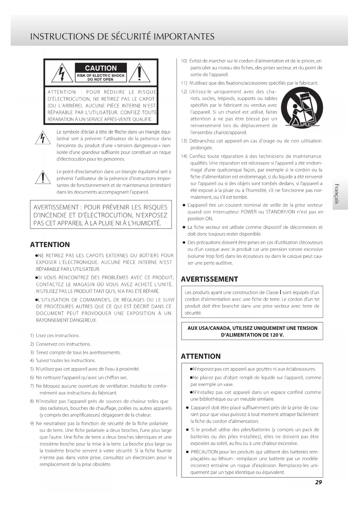D’INCENDIE ET D’ÉLECTROCUTION, N’EXPOSEZ PAS CET APPAREIL À LA PLUIE NI À L’HUMIDITÉ. ATTENTION o NE RETIREZ PAS LES CAPOTS EXTERNES OU BOÎTIERS POUR EXPOSER L’ÉLECTRONIQUE. AUCUNE PIÈCE INTERNE N’EST RÉPARABLE PAR L’UTILISATEUR. o SI VOUS RENCONTREZ DES PROBLÈMES AVEC CE PRODUIT, CONTACTEZ LE MAGASIN OÙ VOUS AVEZ ACHETÉ L’UNITÉ. N’UTILISEZ PAS LE PRODUIT TANT QU’IL N’A PAS ÉTÉ RÉPARÉ. o L’UTILISATION DE COMMANDES, DE RÉGLAGES OU LE SUIVI DE PROCÉDURES AUTRES QUE CE QUI EST DÉCRIT DANS CE DOCUMENT PEUT PROVOQUER UNE EXPOSITION À UN RAYONNEMENT DANGEREUX.1) Lisez ces instructions.2) Conservez ces instructions.3) Tenez compte de tous les avertissements.4) Suivez toutes les instructions.5) N’utilisez pas cet appareil avec de l’eau à proximité.6) Ne nettoyez l’appareil qu’avec un chiffon sec.7) Ne bloquez aucune ouverture de ventilation. Installez-le confor-mément aux instructions du fabricant.8) N’installez pas l’appareil près de sources de chaleur telles que des radiateurs, bouches de chauffage, poêles ou autres appareils (y compris des amplificateurs) dégageant de la chaleur.9) Ne neutralisez pas la fonction de sécurité de la fiche polarisée ou de terre. Une fiche polarisée a deux broches, l’une plus large que l’autre. Une fiche de terre a deux broches identiques et une troisième broche pour la mise à la terre. La broche plus large ou la troisième broche servent à votre sécurité. Si la fiche fournie n’entre pas dans votre prise, consultez un électricien pour le remplacement de la prise obsolète.10) Évitez de marcher sur le cordon d’alimentation et de le pincer, en particulier au niveau des fiches, des prises secteur, et du point de sortie de l’appareil.11) N’utilisez que des fixations/accessoires spécifiés par le fabricant.12) Utilisez-le uniquement avec des cha-riots, socles, trépieds, supports ou tables spécifiés par le fabricant ou vendus avec l’appareil. Si un chariot est utilisé, faites attention à ne pas être blessé par un renversement lors du déplacement de l’ensemble chariot/appareil.13) Débranchez cet appareil en cas d’orage ou de non utilisation prolongée.14) Confiez toute réparation à des techniciens de maintenance qualifiés. Une réparation est nécessaire si l’appareil a été endom-magé d’une quelconque façon, par exemple si le cordon ou la fiche d’alimentation est endommagé, si du liquide a été renversé sur l’appareil ou si des objets sont tombés dedans, si l’appareil a été exposé à la pluie ou à l’humidité, s’il ne fonctionne pas nor-malement, ou s’il est tombé. o L’appareil tire un courant nominal de veille de la prise secteur quand son interrupteur POWER ou STANDBY/ON n’est pas en position ON. o La fiche secteur est utilisée comme dispositif de déconnexion et doit donc toujours rester disponible. o Des précautions doivent être prises en cas d’utilisation d’écouteurs ou d’un casque avec le produit car une pression sonore excessive (volume trop fort) dans les écouteurs ou dans le casque peut cau-ser une perte auditive. AVERTISSEMENT Les produits ayant une construction de Classe ! sont équipés d’un cordon d’alimentation avec une fiche de terre. Le cordon d’un tel produit doit être branché dans une prise secteur avec terre de sécurité.AUX USA/CANADA, UTILISEZ UNIQUEMENT UNE TENSION D’ALIMENTATION DE 120V. ATTENTION o N’exposez pas cet appareil aux gouttes ni aux éclaboussures. o Ne placez pas d’objet rempli de liquide sur l’appareil, comme par exemple un vase. o N’installez pas cet appareil dans un espace confiné comme une bibliothèque ou un meuble similaire. o L’appareil doit être placé suffisamment près de la prise de cou- rant pour que vous puissiez à tout moment attraper facilement la fiche du cordon d’alimentation. o Si le produit utilise des piles/batteries (y compris un pack de batteries ou des piles installées), elles ne doivent pas être exposées au soleil, au feu ou à une chaleur excessive. o PRÉCAUTION pour les produits qui utilisent des batteries rem- plaçables au lithium: remplacer une batterie par un modèle incorrect entraîne un risque d’explosion. Remplacez-les uni-quement par un type identique ou équivalent.30 INSTRUCTIONS DE SÉCURITÉ IMPORTANTES (suite) V Précautions concernant les piles Un mauvais emploi des piles peut entraîner leur rupture ou leur fuite, avec pour conséquence un incendie, des blessures ou la salissure des objets proches. Veuillez lire et suivre attentivement les précautions suivantes. o Veillez à insérer les piles avec leurs pôles positif (¥) et négatif (^) correctement orientés. o Utilisez des piles du même type. N’utilisez jamais des types de pile différents ensemble. o Si la télécommande doit rester inutilisée durant une période pro- longée (plus d’un mois), retirez ses piles pour éviter qu’elles ne coulent. o Si les piles coulent, essuyez le liquide dans le compartiment des piles et remplacez les piles par des neuves. o N’utilisez pas de piles d’un type autre que celui spécifié. Ne mélan- gez pas des piles neuves avec des anciennes et n’utilisez pas ensemble des types de pile différents. o Ne chauffez pas et ne démontez pas les piles. Ne jetez jamais les piles dans un feu ou dans de l’eau. o Ne conservez et ne transportez pas les piles avec d’autres objets métalliques. Les piles pourraient entrer en court-circuit, couler ou exploser. o Ne rechargez jamais une batterie sans avoir vérifié qu’elle peut l’être. o N’exposez pas les piles à une pression d’air extrêmement basse car cela pourrait entraîner une explosion ou une fuite de liquides ou de gaz inflammables. Modèle pour le Canada Déclaration de conformité d’Innovation, Sciences et Développement économique Canada: CET APPAREIL NUMÉRIQUE DE LA CLASSE B EST CONFORME À LA