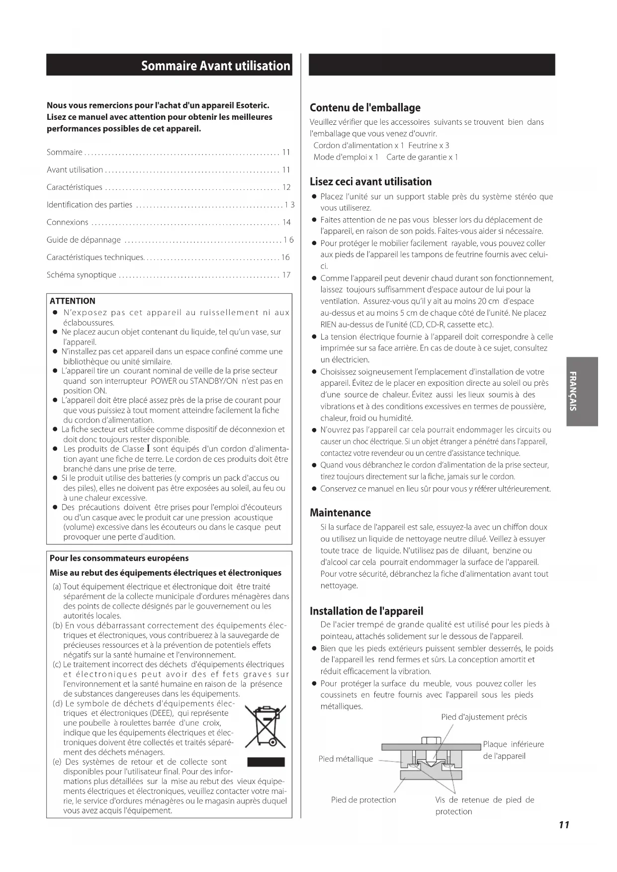 - Quand vous débranchez le cordon d’alimentation de la prise secteur, tirez toujours directement sur la fiche, jamais sur le cordon. < Conservez ce manuel en lieu sûr pour vous y référer ultérieurement. Maintenance Si la surface de l'appareil est sale, essuyez-la avec un chiffon doux ou utilisez un liquide de nettoyage neutre dilué. Veillez à essuyer toute trace de liquide. N'utilisez pas de diluant, benzine ou d'alcool car cela pourrait endommager la surface de l'appareil. Pour votre sécurité, débranchez la fiche d'alimentation avant tout nettoyage. Installation de l'appareil De l'acier trempé de grande qualité est utilisé pour les pieds à pointeau, attachés solidement sur le dessous de l'appareil. < Bien que les pieds extérieurs puissent sembler desserrés, le poids de l'appareil les rend fermes et sûrs. La conception amortit et réduit efficacement la vibration. < Pour protéger la surface du meuble, vous pouvez coller les coussinets en feutre fournis avec l'appareil sous les pieds métalliques. Sommaire Avant utilisation Nous vous remercions pour l'achat d'un appareil Esoteric. Lisez ce manuel avec attention pour obtenir les meilleures performances possibles de cet appareil. Sommaire p. 11
