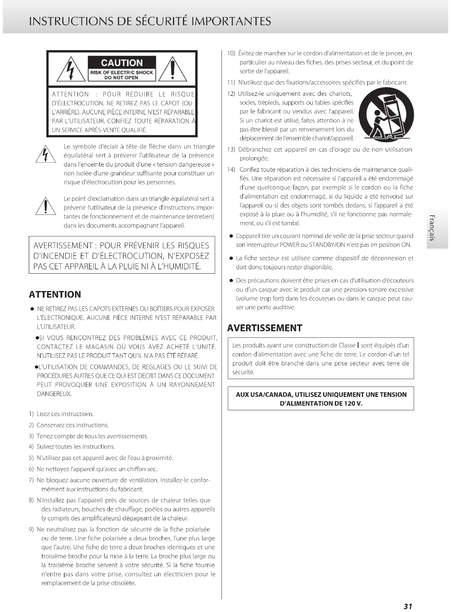 D’INCENDIE ET D’ÉLECTROCUTION, N’EXPOSEZ PAS CET APPAREIL À LA PLUIE NI À L’HUMIDITÉ. ATTENTION o NE RETIREZ PAS LES CAPOTS EXTERNES OU BOÎTIERS POUR EXPOSER L’ÉLECTRONIQUE. AUCUNE PIÈCE INTERNE N’EST RÉPARABLE PAR L’UTILISATEUR. o SI VOUS RENCONTREZ DES PROBLÈMES AVEC CE PRODUIT, CONTACTEZ LE MAGASIN OÙ VOUS AVEZ ACHETÉ L’UNITÉ. N’UTILISEZ PAS LE PRODUIT TANT QU’IL N’A PAS ÉTÉ RÉPARÉ. o L’UTILISATION DE COMMANDES, DE RÉGLAGES OU LE SUIVI DE PROCÉDURES AUTRES QUE CE QUI EST DÉCRIT DANS CE DOCUMENT PEUT PROVOQUER UNE EXPOSITION À UN RAYONNEMENT DANGEREUX.1) Lisez ces instructions.2) Conservez ces instructions.3) Tenez compte de tous les avertissements.4) Suivez toutes les instructions.5) N’utilisez pas cet appareil avec de l’eau à proximité.6) Ne nettoyez l’appareil qu’avec un chiffon sec.7) Ne bloquez aucune ouverture de ventilation. Installez-le confor-mément aux instructions du fabricant.8) N’installez pas l’appareil près de sources de chaleur telles que des radiateurs, bouches de chauffage, poêles ou autres appareils (y compris des amplificateurs) dégageant de la chaleur.9) Ne neutralisez pas la fonction de sécurité de la fiche polarisée ou de terre. Une fiche polarisée a deux broches, l’une plus large que l’autre. Une fiche de terre a deux broches identiques et une troisième broche pour la mise à la terre. La broche plus large ou la troisième broche servent à votre sécurité. Si la fiche fournie n’entre pas dans votre prise, consultez un électricien pour le remplacement de la prise obsolète.10) Évitez de marcher sur le cordon d’alimentation et de le pincer, en particulier au niveau des fiches, des prises secteur, et du point de sortie de l’appareil.11) N’utilisez que des fixations/accessoires spécifiés par le fabricant.12) Utilisez-le uniquement avec des chariots, socles, trépieds, supports ou tables spécifiés par le fabricant ou vendus avec l’appareil. Si un chariot est utilisé, faites attention à ne pas être blessé par un renversement lors du déplacement de l’ensemble chariot/appareil.13) Débranchez cet appareil en cas d’orage ou de non utilisation prolongée.