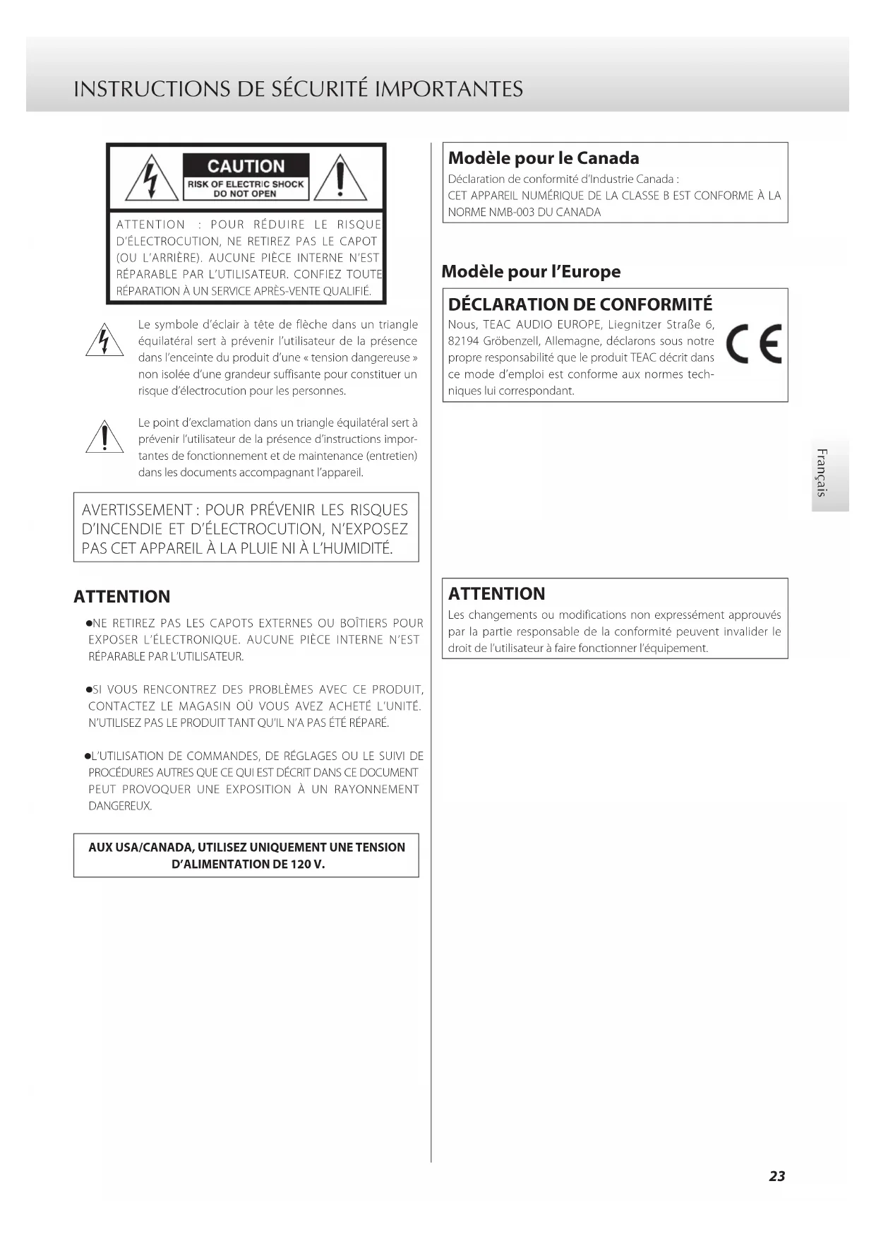Nous, TEAC AUDIO EUROPE, Liegnitzer Straße 6, 82194 Gröbenzell, Allemagne, déclarons sous notre propre responsabilité que le produit TEAC décrit dans ce mode d’emploi est conforme aux normes tech-niques lui correspondant. ATTENTION Les changements ou modifications non expressément approuvés par la partie responsable de la conformité peuvent invalider le droit de l’utilisateur à faire fonctionner l’équipement.24 INSTRUCTIONS DE SÉCURITÉ IMPORTANTES (suite)