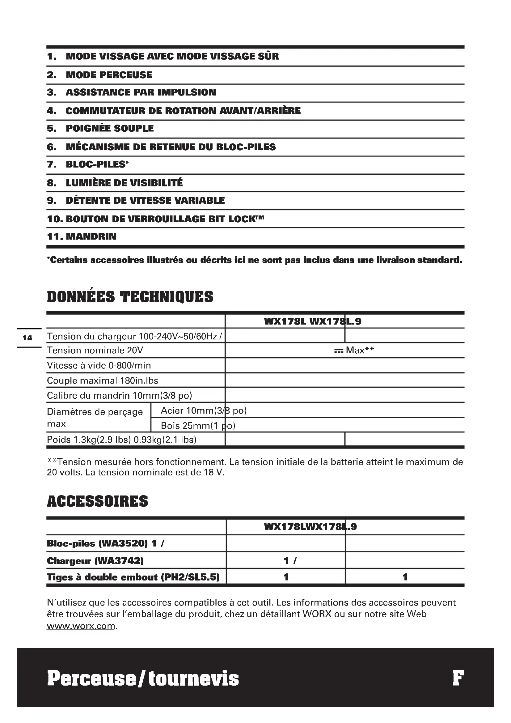 WX178L WX178L.9 Tension du chargeur 100-240V~50/60Hz / Tension nominale 20V Max** Vitesse à vide 0-800/min Couple maximal 180in.lbs Calibre du mandrin 10mm(3/8 po) Diamètres de perçage max Acier 10mm(3/8 po) Bois 25mm(1 po) Poids 1.3kg(2.9 lbs) 0.93kg(2.1 lbs) **Tension mesurée hors fonctionnement. La tension initiale de la batterie atteint le maximum de 20 volts. La tension nominale est de 18 V. ACCESSOIRES WX178L WX178L.9 Bloc-piles (WA3520) 1 / Chargeur (WA3742) 1 / Tiges à double embout (PH2/SL5.5) 1 1 N’utilisez que les accessoires compatibles à cet outil. Les informations des accessoires peuvent être trouvées sur l’emballage du produit, chez un détaillant WORX ou sur notre site Web www.worx.com.