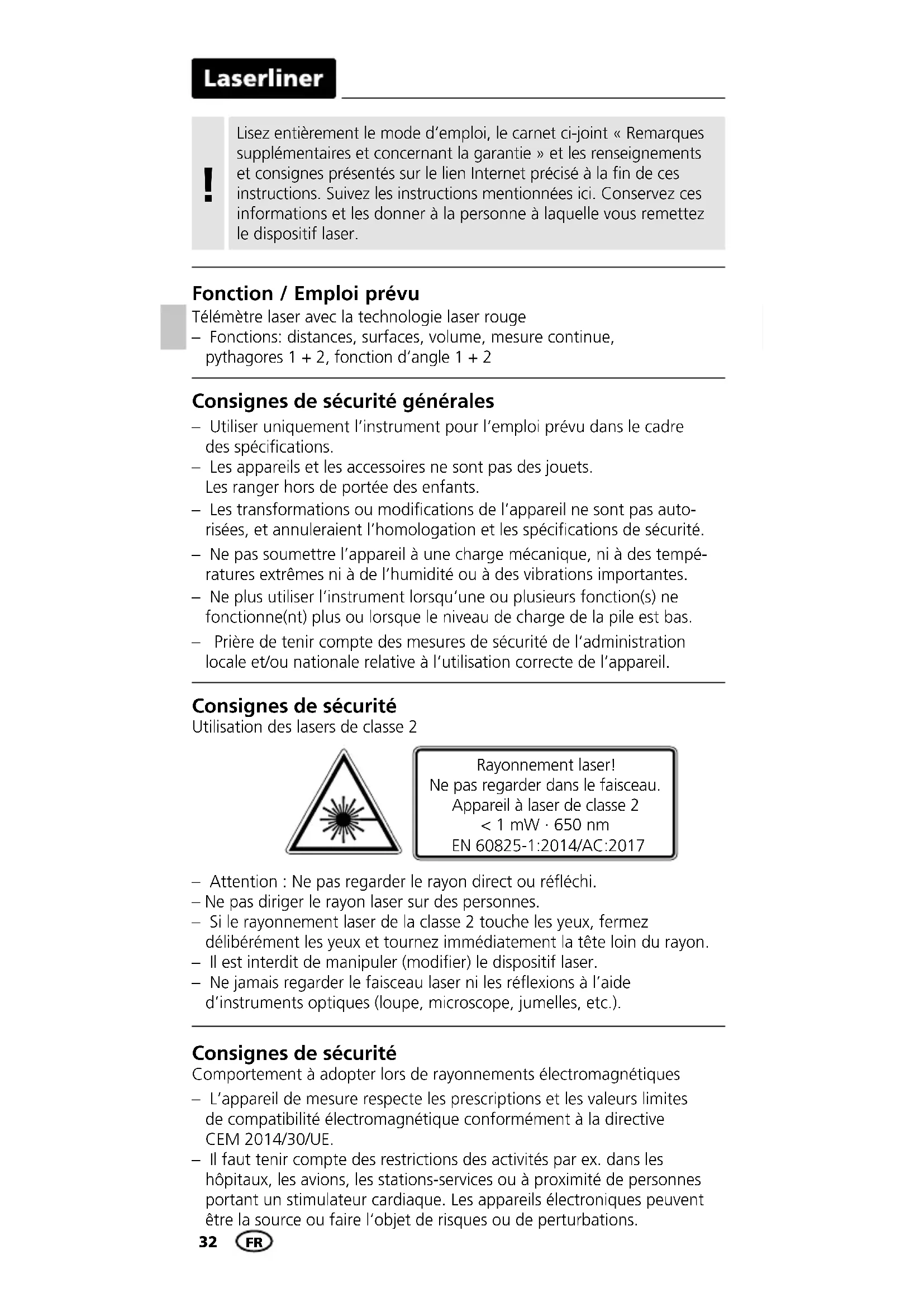 EU- og UK-bestemmelser og bortskaffelse Apparatet opfylder alle påkrævede standarder for fri vareomsætning inden for EU og UK. Dette produkt er et elapparat og skal indsamles og bortskaffes separat i henhold til EF- og UK-direktivet for (brugte) elapparater. Flere sikkerhedsanvisninger og supplerende tips på: http://laserliner.com Anmærkninger vedr. vedligeholdelse og pleje Alle komponenter skal rengøres med en let fugtet klud, og man skal undlade brug af rengørings-, skure- og opløsningsmidler. Batterierne skal tages ud inden længere opbevaringsperioder. Apparatet skal opbevares på et rent og tørt sted. Kalibrering Måleapparatet skal regelmæssigt kalibreres og afprøves for at sikre, at måleresultaterne er nøjagtige. Vi anbefaler et kalibreringsinterval på et år. DA32 Consignes de sécurité générales – Utiliser uniquement l‘instrument pour l‘emploi prévu dans le cadre des spécications. – Les appareils et les accessoires ne sont pas des jouets. Les ranger hors de portée des enfants. – Les transformations ou modications de l’appareil ne sont pas auto- risées, et annuleraient l’homologation et les spécications de sécurité. – Ne pas soumettre l’appareil à une charge mécanique, ni à des tempé- ratures extrêmes ni à de l’humidité ou à des vibrations importantes. – Ne plus utiliser l‘instrument lorsqu‘une ou plusieurs fonction(s) ne fonctionne(nt) plus ou lorsque le niveau de charge de la pile est bas. – Prière de tenir compte des mesures de sécurité de l‘administration locale et/ou nationale relative à l‘utilisation correcte de l‘appareil. – Attention : Ne pas regarder le rayon direct ou rééchi. – Ne pas diriger le rayon laser sur des personnes. – Si le rayonnement laser de la classe 2 touche les yeux, fermez délibérément les yeux et tournez immédiatement la tête loin du rayon. – Il est interdit de manipuler (modier) le dispositif laser. – Ne jamais regarder le faisceau laser ni les réexions à l’aide d’instruments optiques (loupe, microscope, jumelles, etc.). Consignes de sécurité Utilisation des lasers de classe 2 Rayonnement laser! Ne pas regarder dans le faisceau. Appareil à laser de classe 2 < 1 mW · 650 nm EN 60825-1:2014/AC:2017 Consignes de sécurité Comportement à adopter lors de rayonnements électromagnétiques – L’appareil de mesure respecte les prescriptions et les valeurs limites de compatibilité électromagnétique conformément à la directive CEM 2014/30/UE. – Il faut tenir compte des restrictions des activités par ex. dans les hôpitaux, les avions, les stations-services ou à proximité de personnes portant un stimulateur cardiaque. Les appareils électroniques peuvent être la source ou faire l‘objet de risques ou de perturbations. Lisez entièrement le mode d‘emploi, le carnet ci-joint «Remarques supplémentaires et concernant la garantie» et les renseignements et consignes présentés sur le lien Internet précisé à la fin de ces instructions. Suivez les instructions mentionnées ici. Conservez ces informations et les donner à la personne à laquelle vous remettez le dispositif laser.
