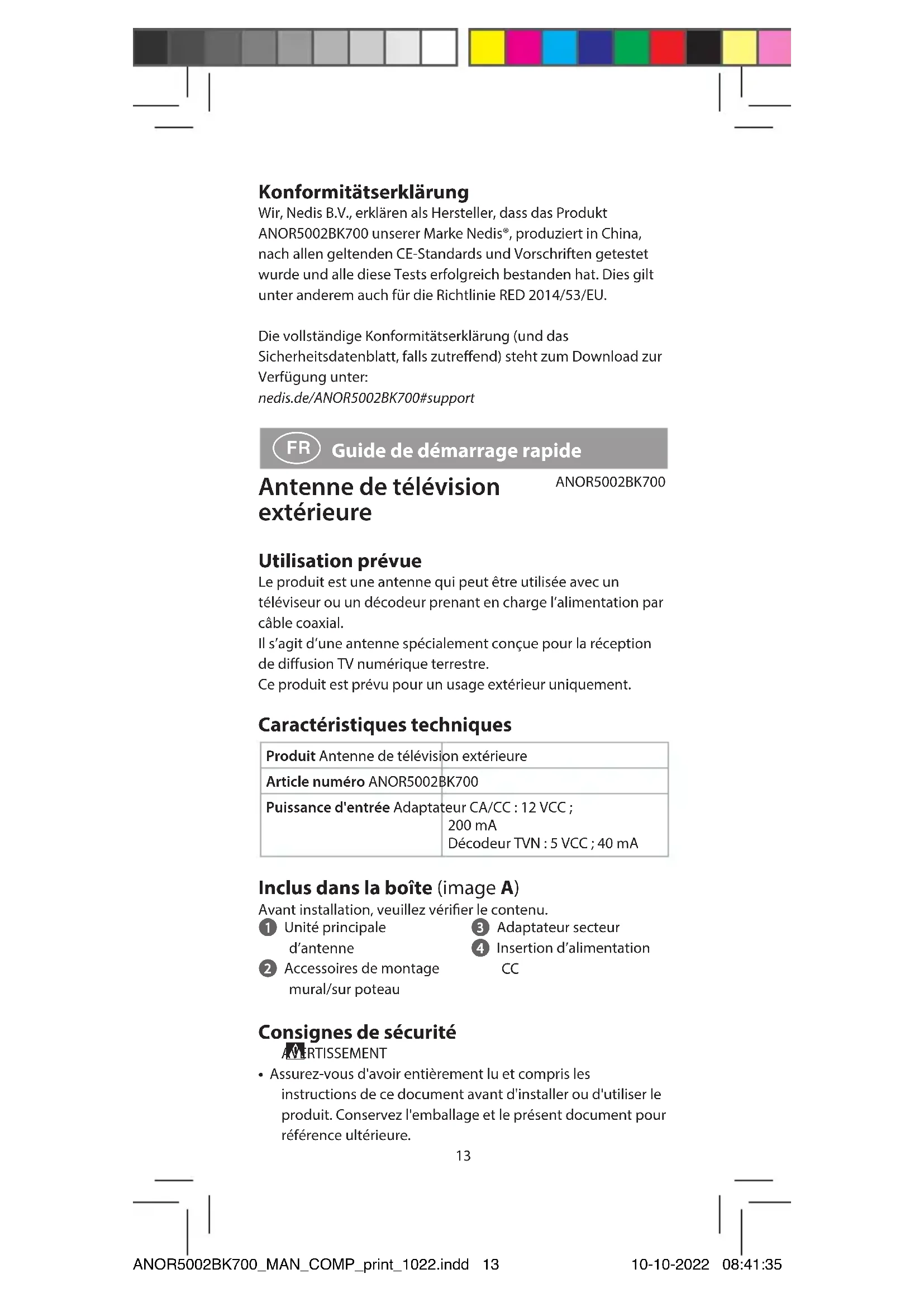 Guide de démarrage rapide Antenne de télévision extérieure ANOR5002BK700 Utilisation prévue Le produit est une antenne qui peut être utilisée avec un téléviseur ou un décodeur prenant en charge l’alimentation par câble coaxial.Il s’agit d’une antenne spécialement conçue pour la réception de diusion TV numérique terrestre.Ce produit est prévu pour un usage extérieur uniquement. Caractéristiques techniques Produit Antenne de télévision extérieureArticle numéro ANOR5002BK700Puissance d'entrée Adaptateur CA/CC: 12VCC; 200mADécodeur TVN: 5VCC; 40mA Inclus dans la boîte (image A) Avant installation, veuillez vérier le contenu. 1 Unité principale d’antenne 2 Accessoires de montage mural/sur poteau 3 Adaptateur secteur 4 Insertion d’alimentation