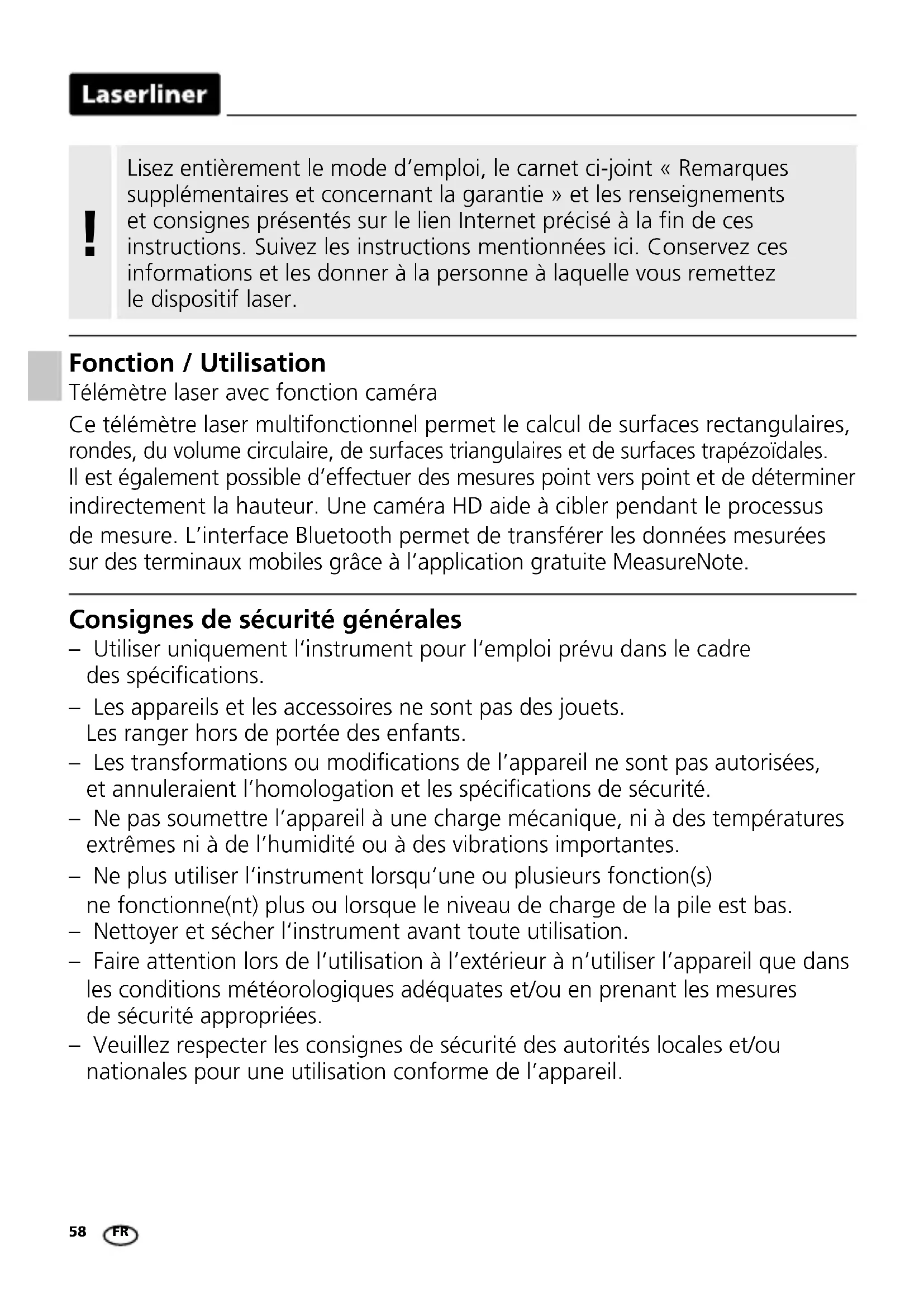 - op til 10 m måleafstand ved godt reflekterende måloverflade og rumtemperatur. Ved større afstande og mindre gode måleforhold som fx kraftigt sollys eller svagt reflekterende måloverflader kan måleafvigelsen stige med ± 0,2 mm/m. ** ved maks. 15.000 lux EU-bestemmelser og bortskaffelse Apparatet opfylder alle påkrævede standarder for fri vareomsætning inden for EU. Dette produkt er et elapparat og skal indsamles og bortskaffes separat i henhold til EF-direktivet for (brugte) elapparater. Flere sikkerhedsanvisninger og supplerende tips på: https://packd.li/ll/akk/in DA58 Consignes de sécurité générales – Utiliser uniquement l‘instrument pour l‘emploi prévu dans le cadre des spécications. – Les appareils et les accessoires ne sont pas des jouets. Les ranger hors de portée des enfants. – Les transformations ou modications de l’appareil ne sont pas autorisées, et annuleraient l’homologation et les spécications de sécurité. – Ne pas soumettre l’appareil à une charge mécanique, ni à des températures extrêmes ni à de l’humidité ou à des vibrations importantes. – Ne plus utiliser l‘instrument lorsqu‘une ou plusieurs fonction(s) ne fonctionne(nt) plus ou lorsque le niveau de charge de la pile est bas. – Nettoyer et sécher l‘instrument avant toute utilisation. – Faire attention lors de l‘utilisation à l‘extérieur à n‘utiliser l‘appareil que dans les conditions météorologiques adéquates et/ou en prenant les mesures de sécurité appropriées. – Veuillez respecter les consignes de sécurité des autorités locales et/ou nationales pour une utilisation conforme de l’appareil. Fonction / Utilisation Télémètre laser avec fonction caméra Ce télémètre laser multifonctionnel permet le calcul de surfaces rectangulaires, rondes, du volume circulaire, de surfaces triangulaires et de surfaces trapézoïdales. Il est également possible d’effectuer des mesures point vers point et de déterminer indirectement la hauteur. Une caméra HD aide à cibler pendant le processus de mesure. L’interface Bluetooth permet de transférer les données mesurées sur des terminaux mobiles grâce à l’application gratuiteMeasureNote. Lisez entièrement le mode d‘emploi, le carnet ci-joint «Remarques supplémentaires et concernant la garantie» et les renseignements et consignes présentés sur le lien Internet précisé à la fin de ces instructions. Suivez les instructions mentionnées ici. Conservez ces informations et les donner à la personne à laquelle vous remettez le dispositif laser.