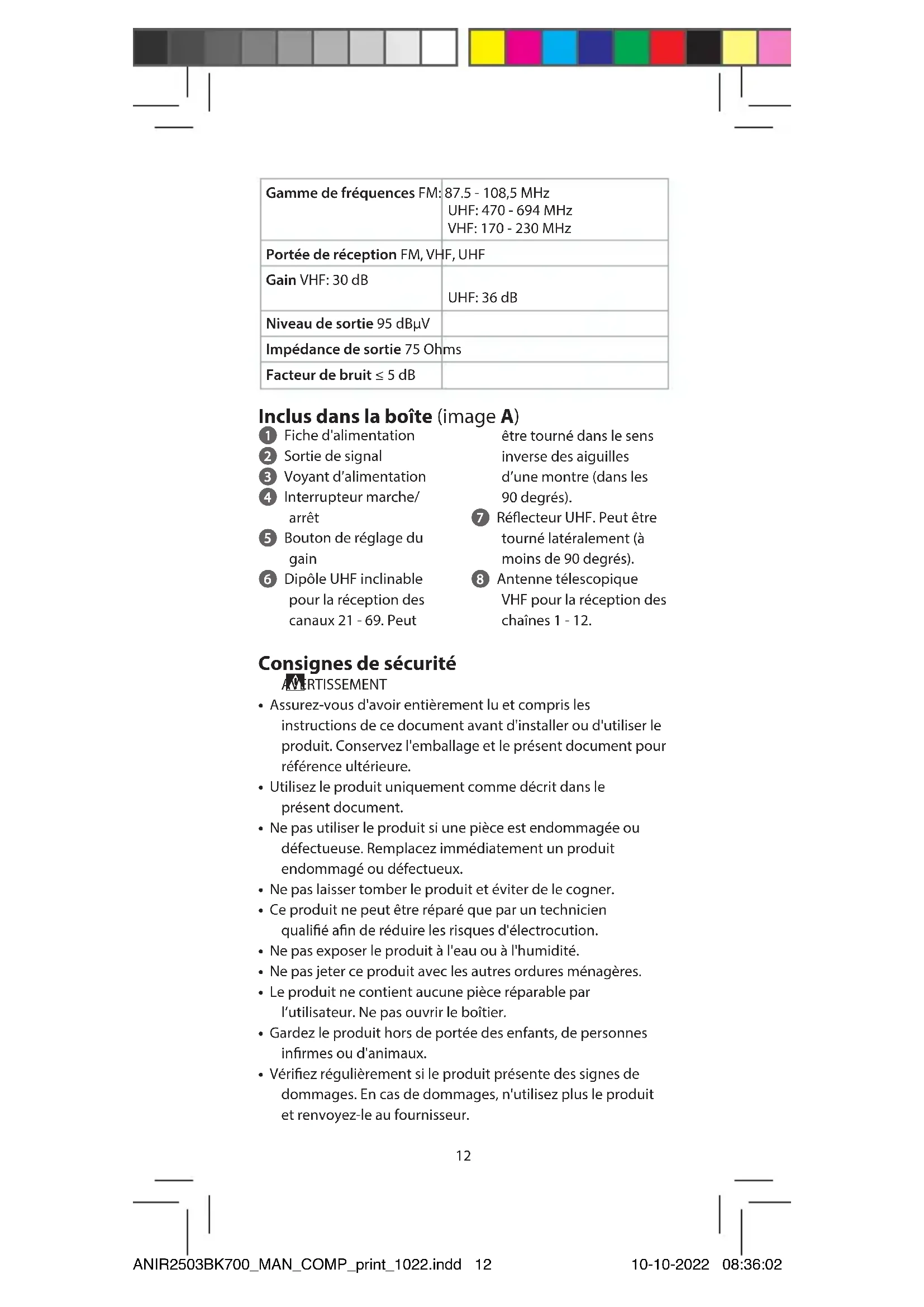 Guide de démarrage rapide Antenne TV intérieure ANIR2503BK700 Utilisation prévue Le produit est une antenne qui peut être utilisée avec un téléviseur ou un décodeur prenant en charge l’alimentation par câble coaxial. Il s’agit d’une antenne spécialement conçue pour la réception de diusion TV numérique terrestre. Le produit est prévu pour un usage intérieur uniquement. Caractéristiques techniques Produit Antenne TV intérieure Article numéro ANIR2503BK700 Puissance d'entrée DC: 12 VDC ; 50 mA AC: 230 V ; 50 Hz ANIR2503BK700_MAN_COMP_print_1022.indd 11ANIR2503BK700_MAN_COMP_print_1022.indd 11 10-10-2022 08:36:0210-10-2022 08:36:0212 Gamme de fréquences FM: 87.5 - 108,5 MHz UHF: 470 - 694 MHz VHF: 170 - 230 MHz Portée de réception FM, VHF, UHF Gain VHF: 30 dB UHF: 36 dB Niveau de sortie 95 dBµV Impédance de sortie 75 Ohms Facteur de bruit ≤ 5 dB Inclus dans la boîte (image A) 1 Fiche d'alimentation 2 Sortie de signal 3 Voyant d’alimentation 4 Interrupteur marche/ arrêt 5 Bouton de réglage du gain 6 Dipôle UHF inclinable pour la réception des canaux 21 - 69. Peut être tourné dans le sens inverse des aiguilles d’une montre (dans les 90 degrés). 7 Réecteur UHF. Peut être tourné latéralement (à moins de 90 degrés). 8 Antenne télescopique VHF pour la réception des chaînes 1 - 12. Consignes de sécurité