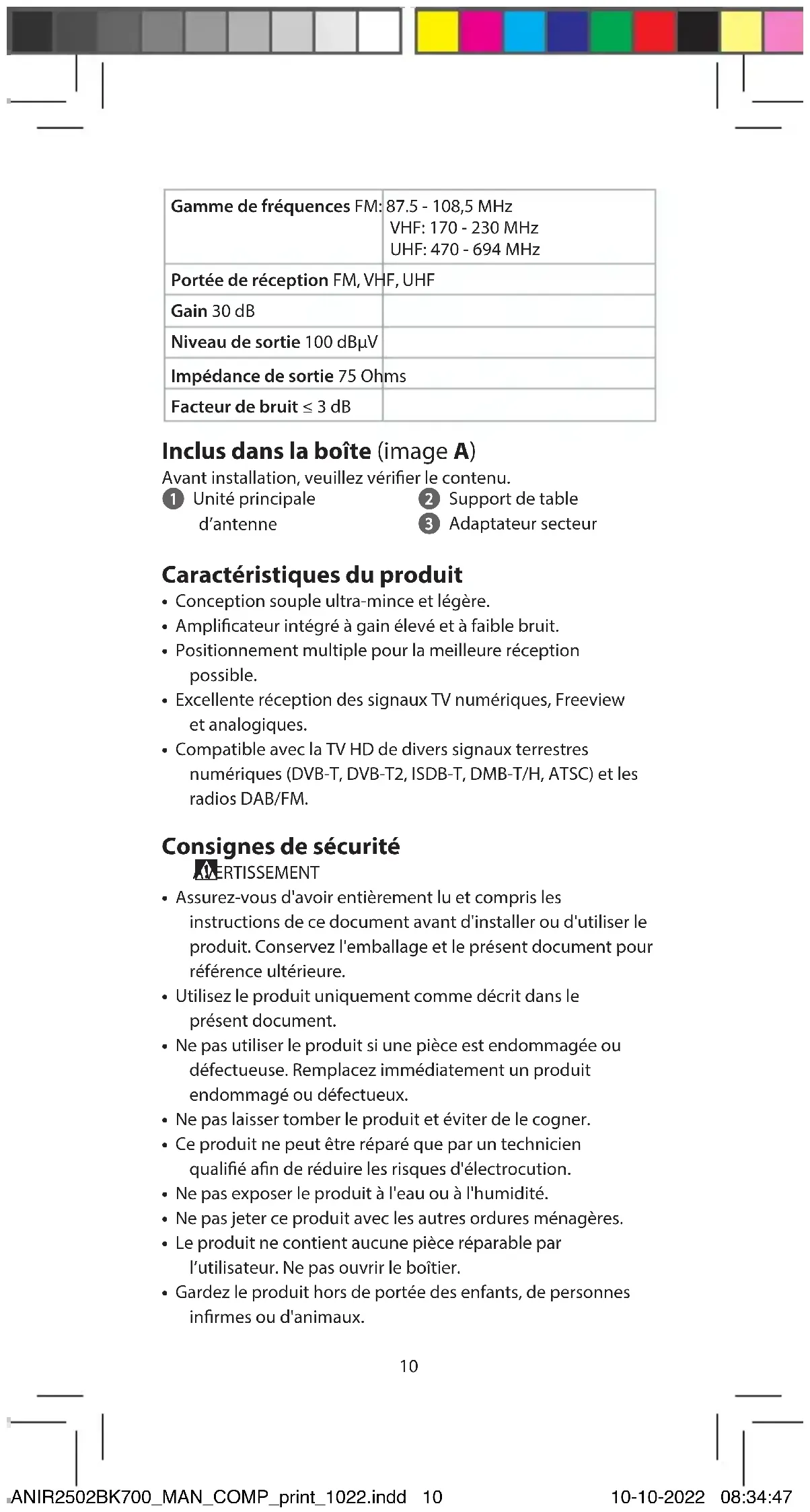 Guide de démarrage rapide Antenne TV intérieure ANIR2502BK700 Utilisation prévue Le produit est une antenne qui peut être utilisée avec un téléviseur ou un décodeur prenant en charge l’alimentation par câble coaxial. Il s’agit d’une antenne spécialement conçue pour la réception de diusion TV numérique terrestre. Le produit est prévu pour un usage intérieur uniquement. Caractéristiques techniques Produit Antenne TV intérieure Article numéro ANIR2502BK700 Puissance d'entrée Adaptateur CA/CC: 5.0VCC; 200mA Décodeur TVN: 5.0VCC; 40mA ANIR2502BK700_MAN_COMP_print_1022.indd 9ANIR2502BK700_MAN_COMP_print_1022.indd 9 10-10-2022 08:34:4710-10-2022 08:34:4710 Gamme de fréquences FM: 87.5 - 108,5 MHz VHF: 170 - 230 MHz UHF: 470 - 694 MHz Portée de réception FM, VHF, UHF Gain 30 dB Niveau de sortie 100 dBµV Impédance de sortie 75 Ohms Facteur de bruit ≤ 3 dB Inclus dans la boîte (image A) Avant installation, veuillez vérier le contenu. 1 Unité principale d’antenne 2 Support de table 3 Adaptateur secteur Caractéristiques du produit