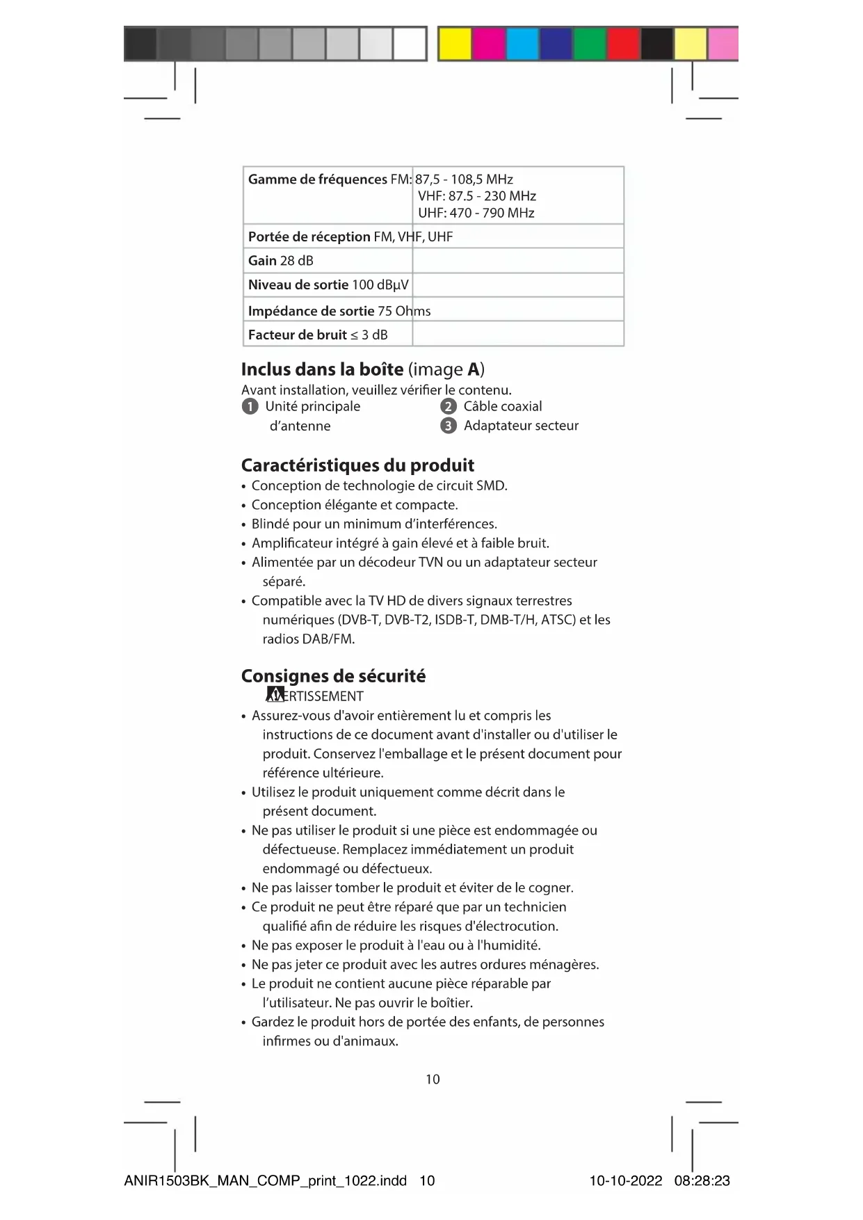 Guide de démarrage rapide Antenne TV intérieure ANIR1503BK Utilisation prévue Le produit est une antenne qui peut être utilisée avec un téléviseur ou un décodeur prenant en charge l’alimentation par câble coaxial. Il s’agit d’une antenne spécialement conçue pour la réception de diusion TV numérique terrestre. Le produit est prévu pour un usage intérieur uniquement. Caractéristiques techniques Produit Antenne TV intérieure Article numéro ANIR1503BK Puissance d'entrée Adaptateur CA/CC: 5.0VCC; 200mA Décodeur TVN: 5.0VCC; 40mA ANIR1503BK_MAN_COMP_print_1022.indd 9ANIR1503BK_MAN_COMP_print_1022.indd 9 10-10-2022 08:28:2310-10-2022 08:28:2310 Gamme de fréquences FM: 87,5 - 108,5 MHz VHF: 87.5 - 230 MHz UHF: 470 - 790 MHz Portée de réception FM, VHF, UHF Gain 28 dB Niveau de sortie 100 dBµV Impédance de sortie 75 Ohms Facteur de bruit ≤ 3 dB Inclus dans la boîte (image A) Avant installation, veuillez vérier le contenu. 1 Unité principale d’antenne 2 Câble coaxial 3 Adaptateur secteur Caractéristiques du produit