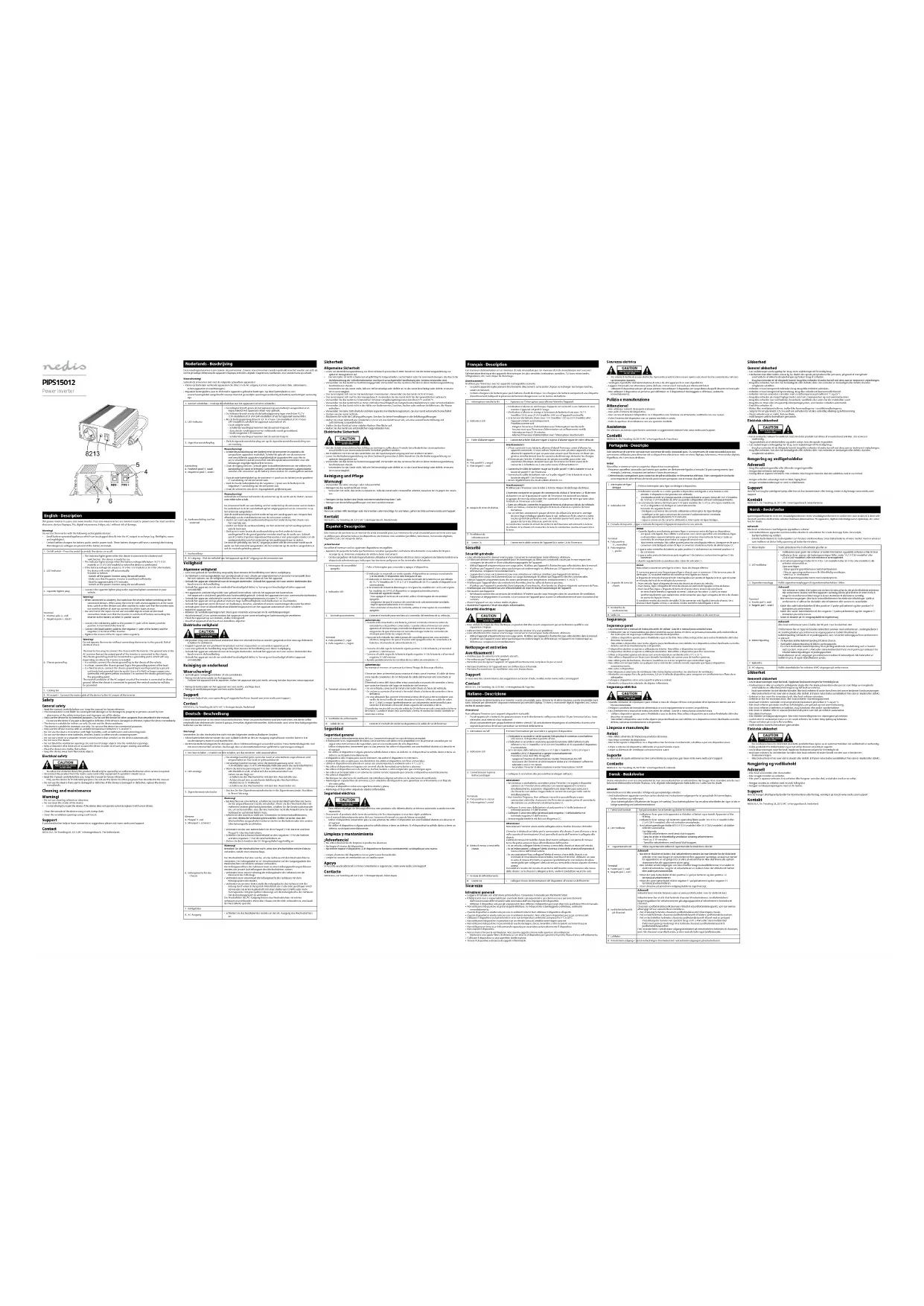 - N'utilisez pas de solvants ni de produits abrasifs.• Ne nettoyez pas l'intérieur de l'appareil.• Ne tentez pas de réparer l'appareil. Si l'appareil fonctionne mal, remplacez-le par un neuf.• Nettoyez l'extérieur de l'appareil avec un chion doux et humide.• Nettoyez les ouvertures de ventilation avec une brosse douce. Support Si vous avez des commentaires, des suggestions ou besoin d'aide, veuillez visiter www.nedis.com/support Contact NEDIS B.V., De Tweeling 28, 5215 MC ‘s-Hertogenbosch, Pays-Bas Italiano - Descrizione Questo inverter di alimentazione è un inverter a onda sinusoidale pura. Gli inverter di alimentazione a onda sinusoidale pura sono utilizzati per alimentare i dispositivi elettronici più sensibili (laptop, TV, forni a microonde digitali, frigoriferi, ecc.) senza rischio di causare danni.Attenzione!Non utilizzare l’inverter con i seguenti dispositivi ricaricabili: