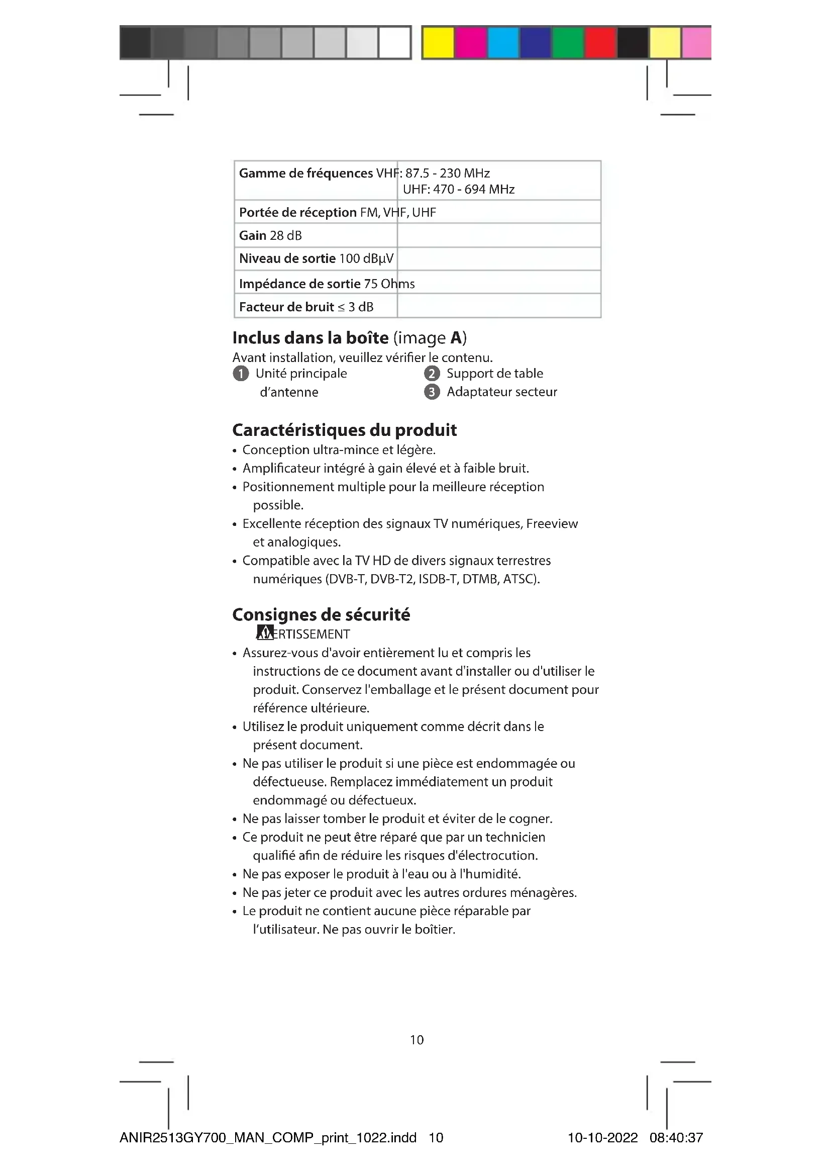 Guide de démarrage rapide Antenne TV intérieure ANIR2513GY700 Utilisation prévue Il s’agit d’une antenne spécialement conçue pour la réception de diusion TV numérique terrestre. Le produit est une antenne qui peut être utilisée avec un téléviseur ou un décodeur prenant en charge l’alimentation par câble coaxial. Le produit est prévu pour un usage intérieur uniquement. Caractéristiques techniques Produit Antenne TV intérieure Article numéro ANIR2513GY700 Puissance d'entrée Adaptateur CA/CC: 12VCC; 200mA Décodeur TVN: 5.0VCC; 40mA ANIR2513GY700_MAN_COMP_print_1022.indd 9ANIR2513GY700_MAN_COMP_print_1022.indd 9 10-10-2022 08:40:3710-10-2022 08:40:3710 Gamme de fréquences VHF: 87.5 - 230 MHz UHF: 470 - 694 MHz Portée de réception FM, VHF, UHF Gain 28 dB Niveau de sortie 100 dBµV Impédance de sortie 75 Ohms Facteur de bruit ≤ 3 dB Inclus dans la boîte (image A) Avant installation, veuillez vérier le contenu. 1 Unité principale d’antenne 2 Support de table 3 Adaptateur secteur Caractéristiques du produit