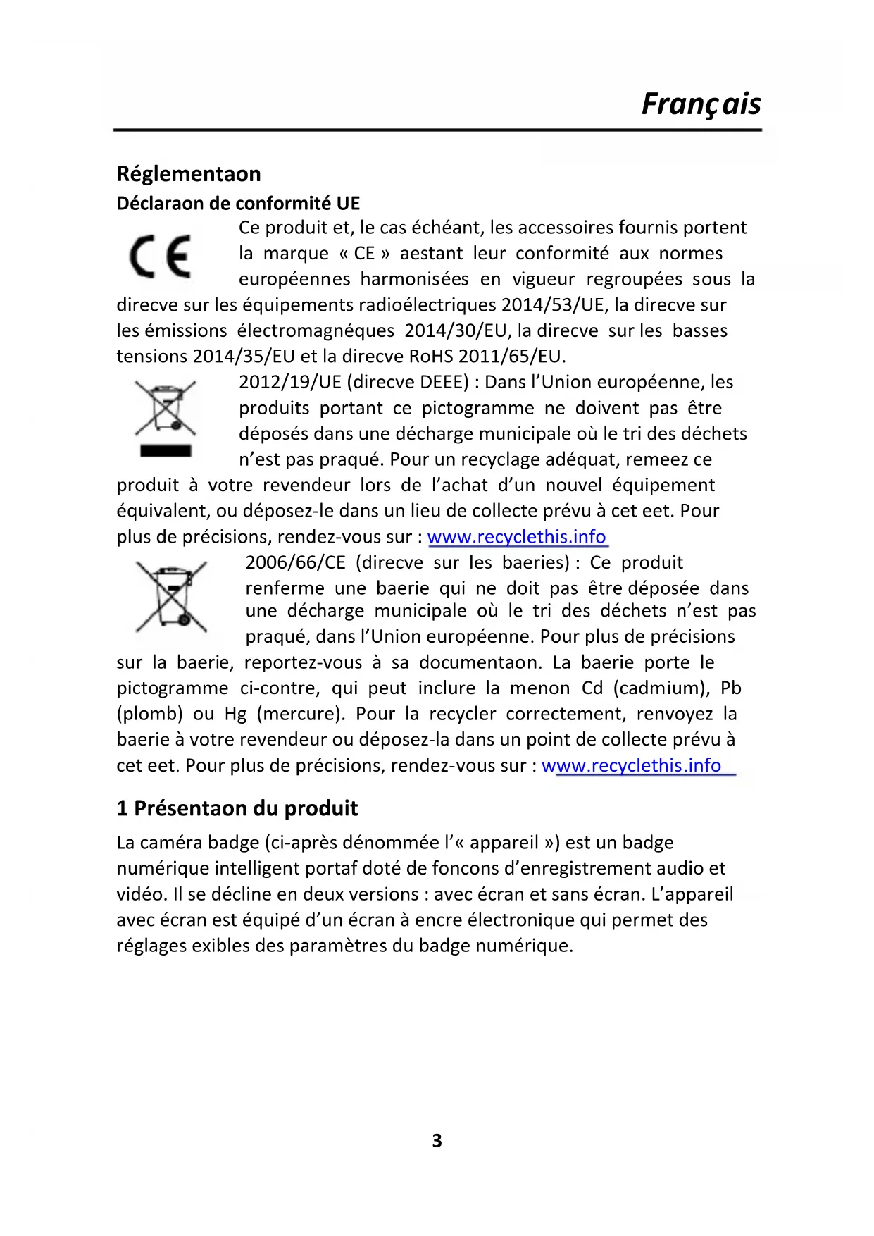 Réglementation Déclaration de conformité UE Ce produit et, le cas échéant, les accessoires fournis portent la marque « CE » attestant leur conformité aux normes européennes harmonisées en vigueur regroupées sous la directive sur les équipements radioélectriques 2014/53/UE, la directive sur les émissions électromagnétiques 2014/30/EU, la directive sur les basses tensions 2014/35/EU et la directive RoHS 2011/65/EU. 2012/19/UE (directive DEEE) : Dans l’Union européenne, les produits portant ce pictogramme ne doivent pas être déposés dans une décharge municipale où le tri des déchets n’est pas pratiqué. Pour un recyclage adéquat, remettez ce produit à votre revendeur lors de l’achat d’un nouvel équipement équivalent, ou déposez-le dans un lieu de collecte prévu à cet effet. Pour plus de précisions, rendez-vous sur : www.recyclethis.info 2006/66/CE (directive sur les batteries) : Ce produit renferme une batterie qui ne doit pas être déposée dans une décharge municipale où le tri des déchets n’est pas pratiqué, dans l’Union européenne. Pour plus de précisions sur la batterie, reportez-vous à sa documentation. La batterie porte le pictogramme ci-contre, qui peut inclure la mention Cd (cadmium), Pb (plomb) ou Hg (mercure). Pour la recycler correctement, renvoyez la batterie à votre revendeur ou déposez-la dans un point de collecte prévu à cet effet. Pour plus de précisions, rendez-vous sur : www.recyclethis.info 1 Présentation du produit La caméra badge (ci-après dénommée l’« appareil ») est un badge numérique intelligent portatif doté de fonctions d’enregistrement audio et vidéo. Il se décline en deux versions : avec écran et sans écran. L’appareil avec écran est équipé d’un écran à encre électronique qui permet des réglages flexibles des paramètres du badge numérique.Français