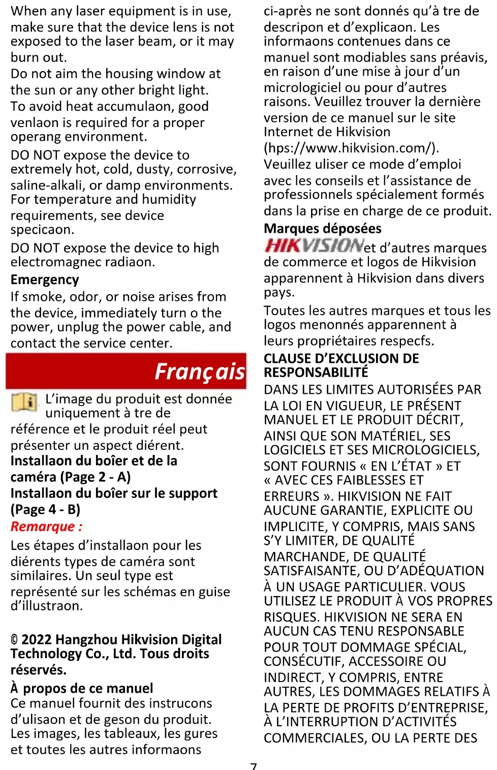 Précautions d’emploi Avertissements Lois et réglementations L’appareil doit être utilisé conformément à la législation locale ainsi qu’aux réglementations en matière de sécurité électrique et de prévention des incendies. Sécurité électrique ATTENTION : Pour réduire le risque d’incendie, remplacez-le uniquement par un fusible de même type et de même calibre. Précautions Prévention des incendies Aucune source de flamme nue, telle que des bougies allumées, ne doit être placée sur l’équipement. Installation Installez l’équipement conformément aux instructions de ce manuel. Afin d’éviter tout accident, cet appareil doit être correctement9 attaché au plafond/mur conformément aux instructions d’installation. Assurez-vous qu’il y a assez d’espace pour l’installation de l’appareil et de ses accessoires. Assurez-vous que le mur est suffisamment solide pour supporter au moins huit fois le poids de l’appareil et de son support. S’assurer que l’alimentation est coupée avant de procéder au câblage, à l’installation ou au démontage de l’appareil. Transport Gardez l’appareil dans son emballage d’origine ou dans un emballage similaire lors de son transport. Ne pas faire tomber le produit ou le soumettre à un choc physique. Alimentation électrique Utilisez un adaptateur d’alimentation fourni par un fabricant qualifié. Il est recommandé de prévoir un adaptateur d’alimentation indépendant pour chaque appareil, car toute surcharge peut entraîner un risque de surchauffe voire d’incendie. Maintenance Si le produit ne fonctionne pas correctement, contactez votre revendeur ou le centre de service le plus proche. Nous n’assumerons aucune responsabilité concernant les problèmes causés par une réparation ou une opération de maintenance non autorisée. Certains composants de l’appareil doivent être remplacés régulièrement. Leur durée de vie moyenne est variable, c’est pourquoi des contrôles périodiques sont recommandés. Veuillez contacter votre distributeur pour plus d’informations. Nettoyage Veuillez nettoyer les parois internes et externes à l’aide d’un chiffon doux et sec. N’utilisez pas de détergent alcalin. Environnement d’exploitation Pendant l’utilisation de tout équipement générant un laser, veillez à ce que l’objectif de l’appareil ne soit pas exposé au faisceau laser, car il pourrait brûler. N’orientez pas la fenêtre du boîtier vers le soleil ou toute autre lumière vive. Pour éviter l’accumulation de chaleur, une bonne aération est requise afin de fournir au produit un environnement de fonctionnement adéquat. N’exposez PAS l’appareil à des environnements extrêmement chauds, froids, poussiéreux, corrosifs, salins-alcalins ou humides. Pour les dispositions nécessaires en matière de température et d’humidité, consultez les spécifications de l’appareil. N’exposez PAS l’appareil à de puissants rayonnements électromagnétiques. Urgence Si de la fumée, des odeurs ou du bruit s’échappent de l’appareil, mettez immédiatement l’appareil hors tension et débranchez le câble d’alimentation, puis contactez un centre de réparation. Deutsch Das Erscheinungsbild des Produkts dient nur als Referenz und kann vom tatsächlichen Produkt abweichen. Installieren des Gehäuses und der Kamera (Seite 2 – A) Installieren des Gehäuses an der Halterung (Seite 4 – B) Hinweis:10 Die Installationsschritte für verschiedene Kameratypen sind ähnlich. In den Diagrammen wird ein Typ zur Veranschaulichung verwendet. © 2022 Hangzhou Hikvision Digital Technology Co., Ltd. Alle Rechte vorbehalten. Hinweise zu dieser Bedienungsanleitung Die Bedienungsanleitung enthält Anleitungen zur Verwendung und Verwaltung des Produkts. Bilder, Diagramme, Abbildungen und alle sonstigen Informationen dienen nur der Beschreibung und Erklärung. Die Änderung der in der Bedienungsanleitung enthaltenen Informationen ist aufgrund von Firmware-Aktualisierungen oder aus anderen Gründen vorbehalten. Die neueste Version dieser Bedienungsanleitung finden Sie auf der Hikvision-Website (https://www.hikvision.com/). Bitte verwenden Sie diese Bedienungsanleitung unter Anleitung und Unterstützung von Fachleuten, die für den Support des Produkts geschult sind. Markenzeichen und andere Marken sowie Logos von Hikvision sind das Eigentum von Hikvision in verschiedenen Ländern. Andere hier erwähnte Marken und Logos sind Eigentum ihrer jeweiligen Inhaber. HAFTUNGSAUSSCHLUSS