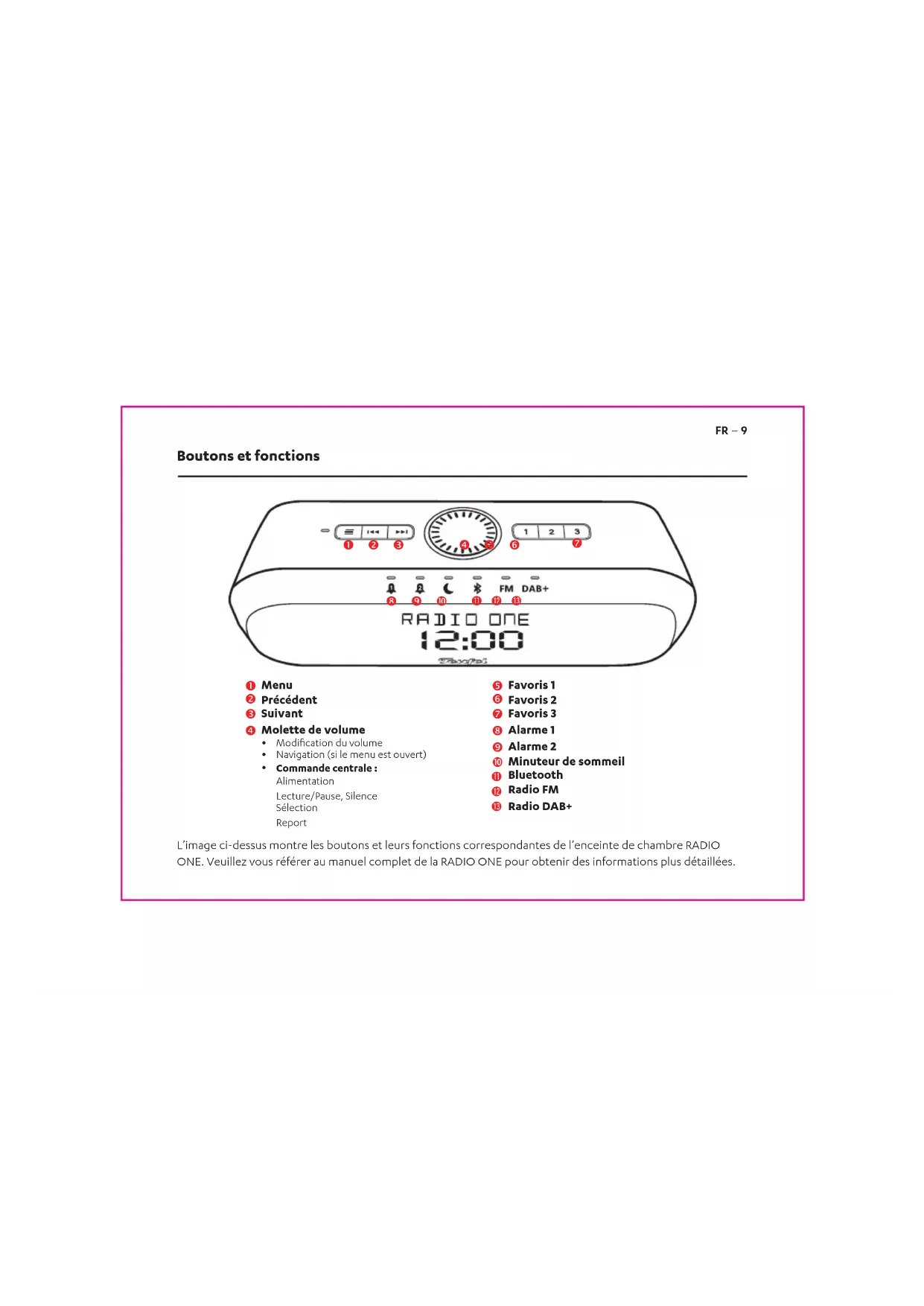 ONE.Boutons et fonctions L’image ci-dessus montre les boutons et leurs fonctions correspondantes de l’enceinte de chambre RADIO ONE. Veuillez vous référer au manuel complet de la RADIO ONE pour obtenir des informations plus détaillées.