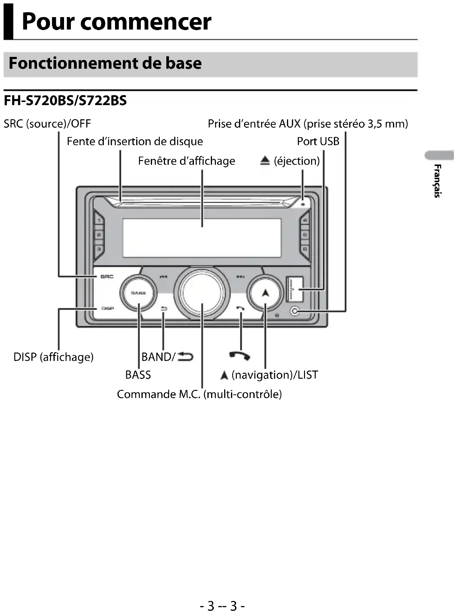 Français FH-S720BS/S722BS Pour commencer Fonctionnement de base SRC (source)/OFF Fenêtre d’affichage Commande M.C. (multi-contrôle) BAND/ DISP (affichage) (navigation)/LIST Port USB Prise d’entrée AUX (prise stéréo 3,5 mm) (éjection) Fente d’insertion de disque BASS- 4 - Français FH-S520BT/S52BT SRC (source)/OFF Fenêtre d’affichage Commande M.C. (multi-contrôle) BAND/ DISP (affichage) (navigation)/LIST Port USB Prise d’entrée AUX (prise stéréo 3,5 mm) (éjection) Fente d’insertion de disque BASS- 5 -- 5 - Français