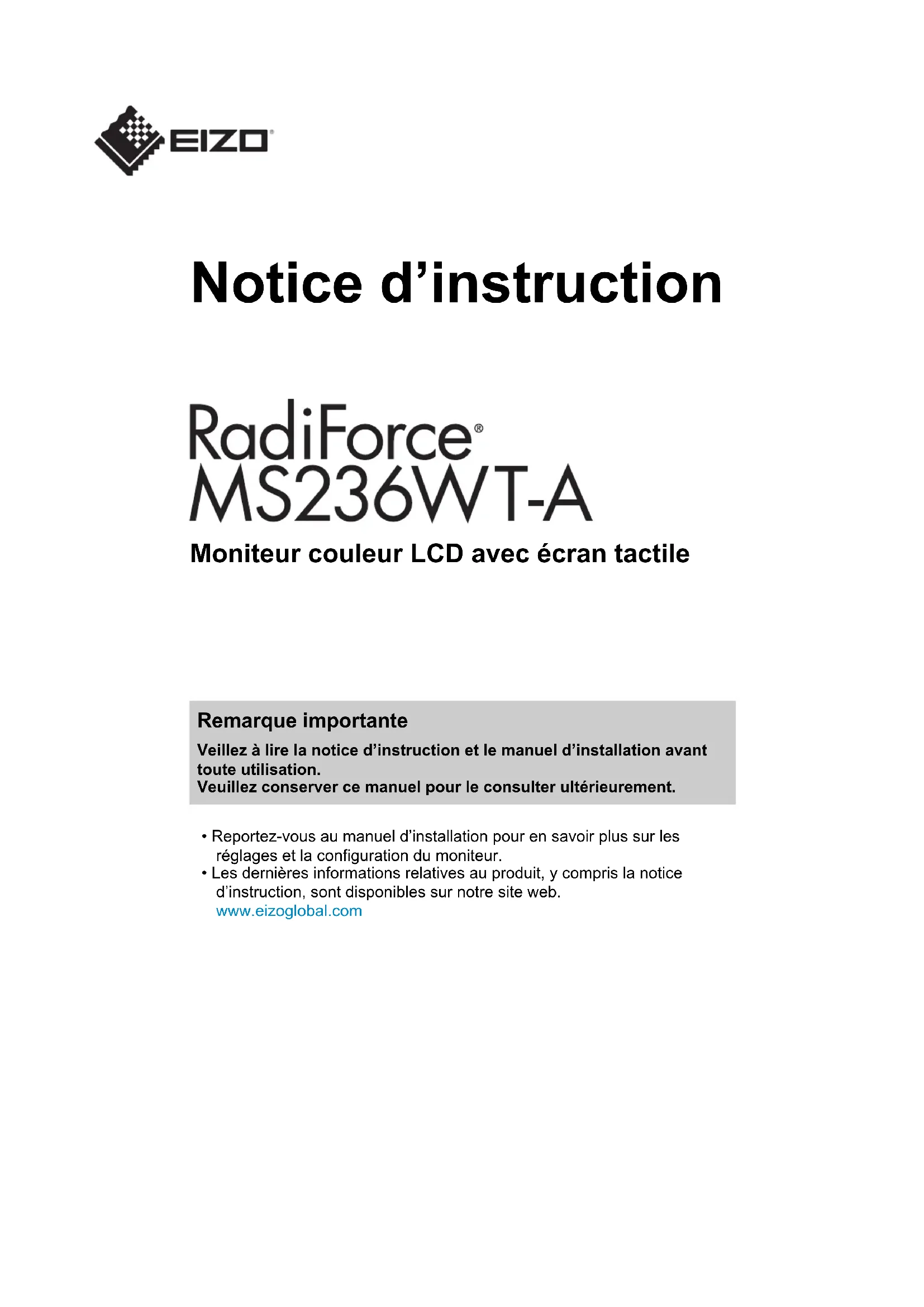 - Les dernières informations relatives au produit, y compris la notice d’instruction, sont disponibles sur notre site web. www.eizoglobal.com2