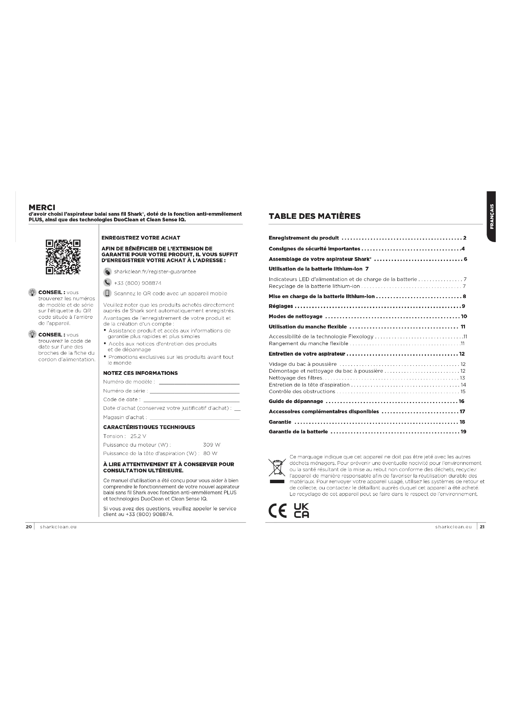 Lorsqu’un client achète en France, il bénéficie des droits légaux relatifs à la conformité du produit («vos droits légaux» : garantie légale de conformité de 2 ans à compter de la délivrance et garantie légale des vices cachés de 2 ans à compter de la découverte du vice) Le client peut faire valoir ces droits à l’encontre de son détaillant Toutefois, Shark® a une grande confiance quant à la qualité de ses produits et fournit donc au propriétaire initial du produit une garantie fabricant supplémentaire pouvant aller jusqu’à cinq ans (2ans de garantie standard et 3ans de garantie supplémentaire lors de l’enregistrement) Ces conditions s’appliquent uniquement à notre garantie commerciale Vos droits légaux ne sont pas aectés Nos conditions de garantie sont les suivantes Elles ne portent aucunement atteinte à vos droits légaux ou aux obligations de votre détaillant à votre égard La batterie lithium-ion n’est pas couverte par la garantie de cinq ans (voir la garantie relative à la batterie à la page suivante) Garantie Shark® Un appareil électroménager, tel qu’un aspirateur, constitue un gros investissement Votre nouvel appareil doit donc fonctionner correctement le plus longtemps possible La garantie fournie avec l’appareil reflète la confiance dont le fabricant fait preuve à l’égard de ses produits et témoigne de la qualité de la fabrication Ce produit Shark® est fourni avec une garantie légale gratuite conformément à vos droits légaux (conformité et vices cachés) Notre service d’assistance téléphonique à la clientèle (08008620453) est ouvert de 9h à 18h, du lundi au vendredi L’appel est gratuit et vous serez directement mis en contact avec un représentant Shark® Vous trouverez également une assistance en ligne sur www.sharkclean.eu Comment puis-je enregistrer mon extension de garantie commerciale Shark®? Vous pouvez enregistrer votre garantie commerciale en ligne dans un délai de 28jours après la date d’achat de votre produit Pour gagner du temps, préparez les données suivantes de votre appareil: