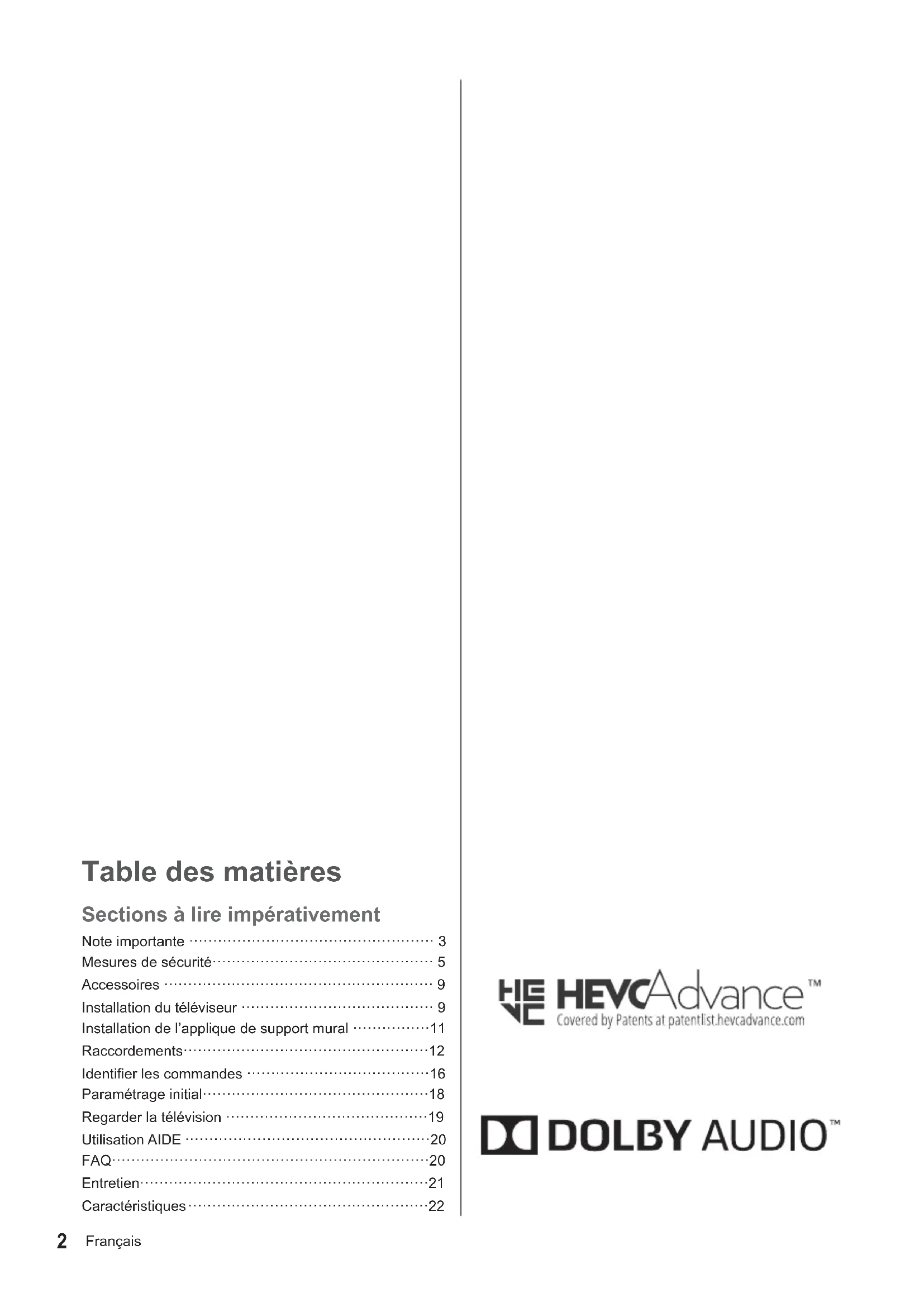 Ce téléviseur répond parfaitement aux normes (depuis décembre 2020) des services numériques terrestres DVB-T / T2 (MPEG2, MPEG4-AVC(H.264) et MPEG HEVC(H.265)), des services numériques par câble DVB-C (MPEG2, MPEG4-AVC(H.264) et MPEG HEVC(H.265)) et des services numériques par satellite DVB-S (MPEG2, MPEG4-AVC(H.264) et MPEG HEVC(H.265)). Veuillez consulter votre revendeur local pour la disponibilité des services DVB-T / T2 ou DVB-S dans votre région. Consultez votre prestataire de services câblés pour la disponibilité des services DVB-C avec ce téléviseur.