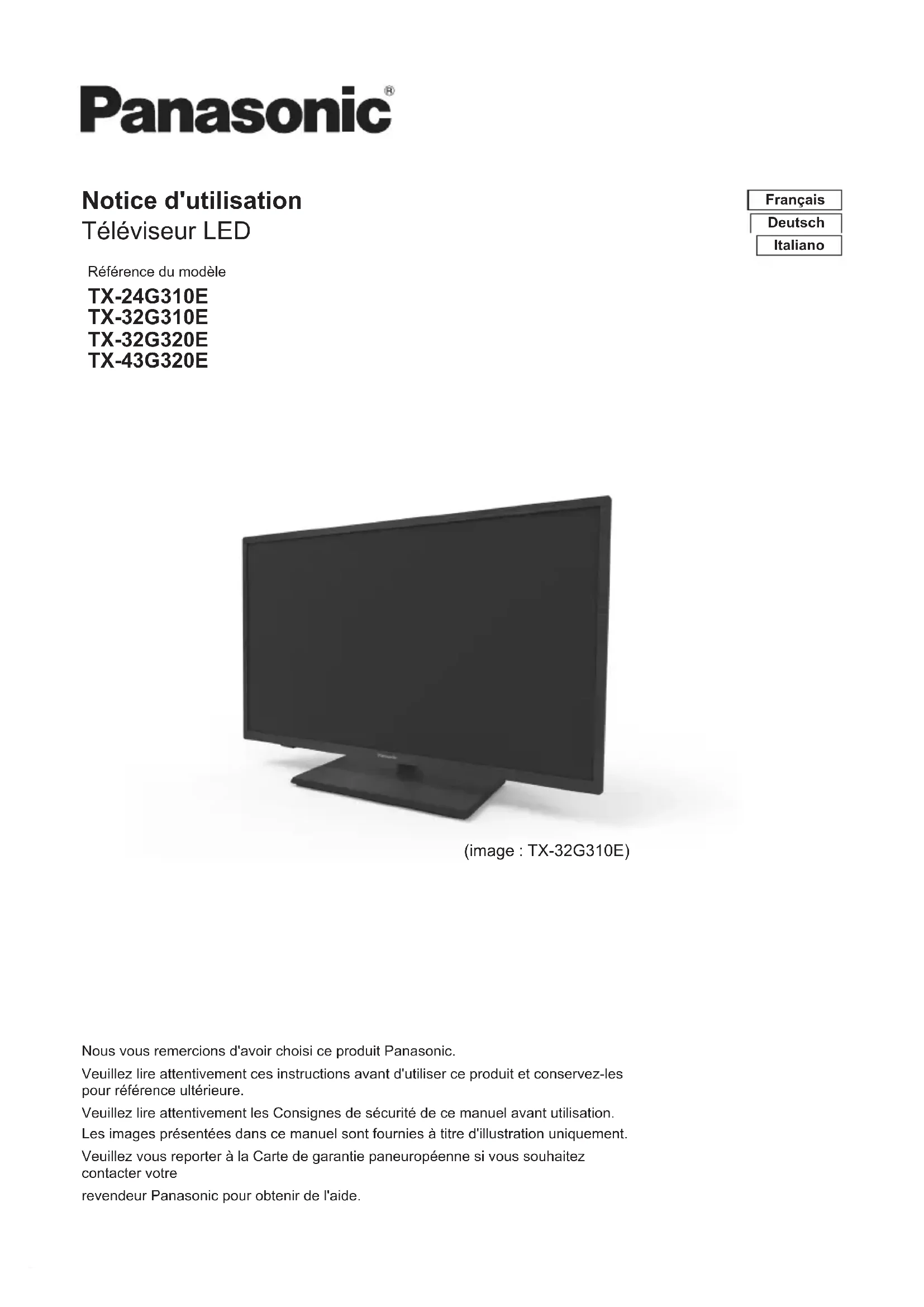 - Notice d'utilisation Téléviseur LED Référence du modèle TX-24G310E TX-32G310E TX-32G320E TX-43G320E Français Deutsch Italiano (image: TX-32G310E) Nous vous remercions d'avoir choisi ce produit Panasonic. Veuillez lire attentivement ces instructions avant d'utiliser ce produit et conservez-les pour référence ultérieure. Veuillez lire attentivement les Consignes de sécurité de ce manuel avant utilisation. Les images présentées dans ce manuel sont fournies à titre d'illustration uniquement. Veuillez vous reporter à la Carte de garantie paneuropéenne si vous souhaitez contacter votre revendeur Panasonic pour obtenir de l'aide. (image : TX-32G310E)2 Français Sauf indication contraire, les illustrations utilisées dans ce manuel correspondent au modèle TX-32G310E. Les illustrations peuvent être différentes selon le modèle. Sommaire Licence p. 2