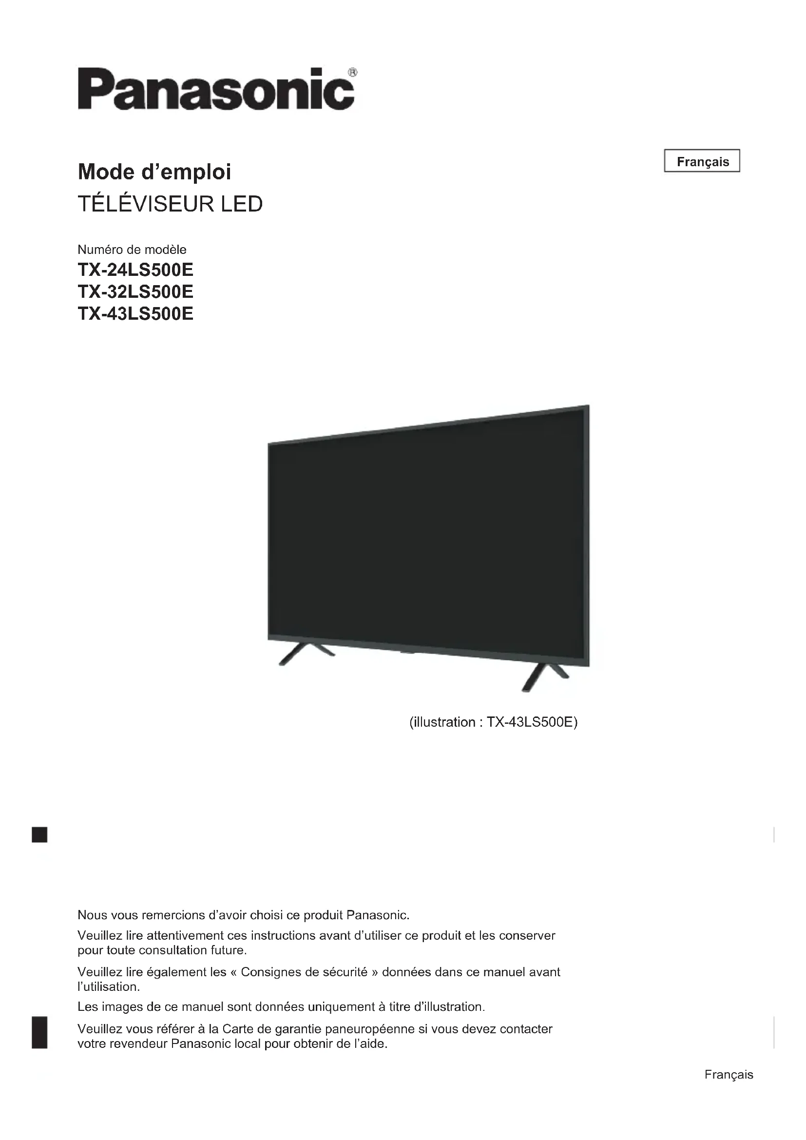 Français Nous vous remercions d’avoir choisi ce produit Panasonic. Veuillez lire attentivement ces instructions avant d’utiliser ce produit et les conserver pour toute consultation future. Veuillez lire également les « Consignes de sécurité » données dans ce manuel avant l’utilisation. Les images de ce manuel sont données uniquement à titre d’illustration. Veuillez vous référer à la Carte de garantie paneuropéenne si vous devez contacter votre revendeur Panasonic local pour obtenir de l’aide. (illustration : TX-43LS500E) FrançaisFrançais