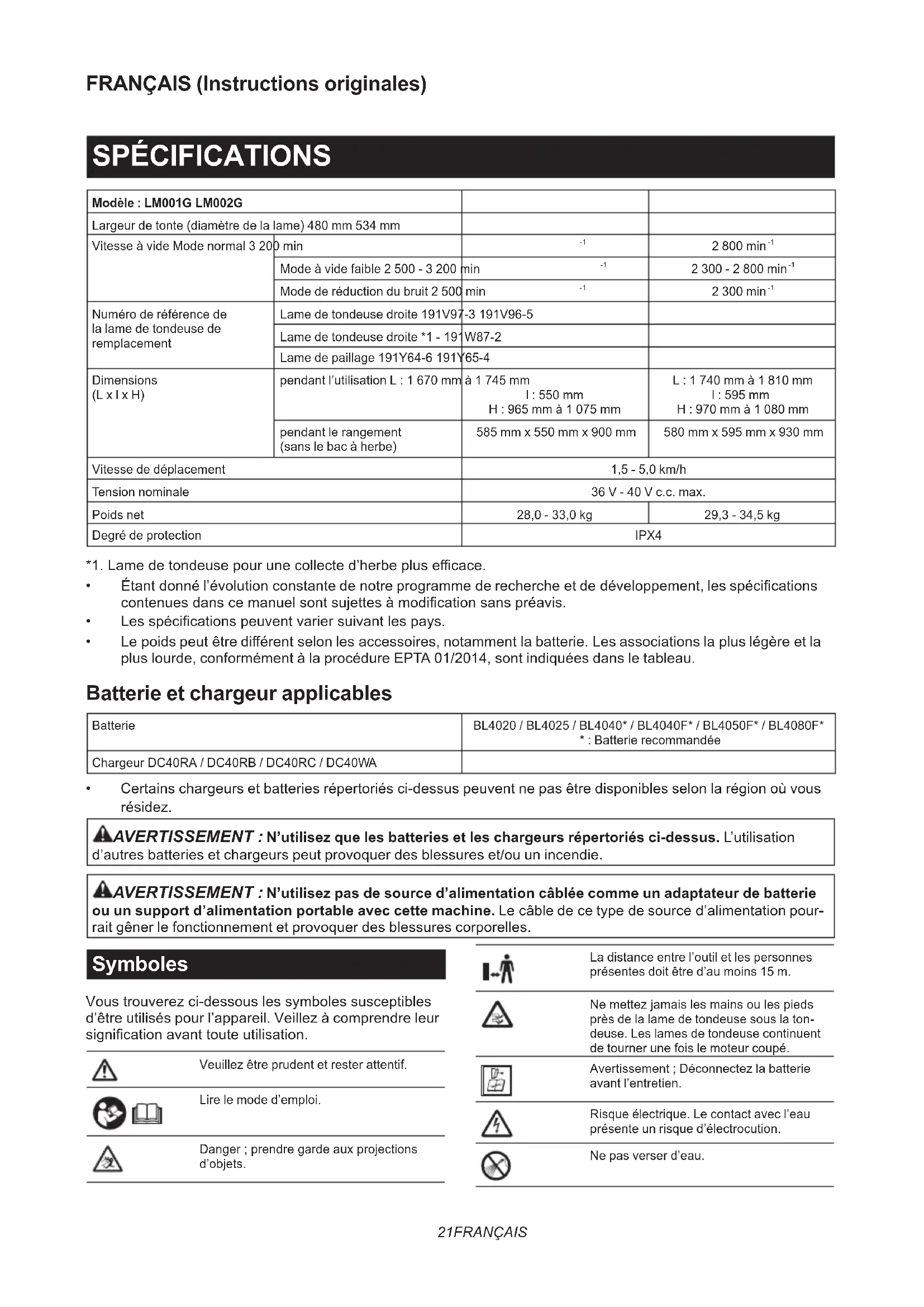Numéro de référence de la lame de tondeuse de remplacement Lame de tondeuse droite 191V97-3 191V96-5 Lame de tondeuse droite *1 - 191W87-2 Lame de paillage 191Y64-6 191Y65-4 Dimensions (L x l x H) pendant l’utilisation L : 1 670 mm à 1 745 mm l : 550 mm H : 965 mm à 1 075 mm L : 1 740 mm à 1 810 mm l : 595 mm H : 970 mm à 1 080 mm pendant le rangement (sans le bac à herbe) 585 mm x 550 mm x 900 mm 580 mm x 595 mm x 930 mm Vitesse de déplacement 1,5 - 5,0 km/h Tension nominale 36 V - 40 V c.c. max. Poids net 28,0 - 33,0 kg 29,3 - 34,5 kg Degré de protection IPX4 *1. Lame de tondeuse pour une collecte d’herbe plus ecace.