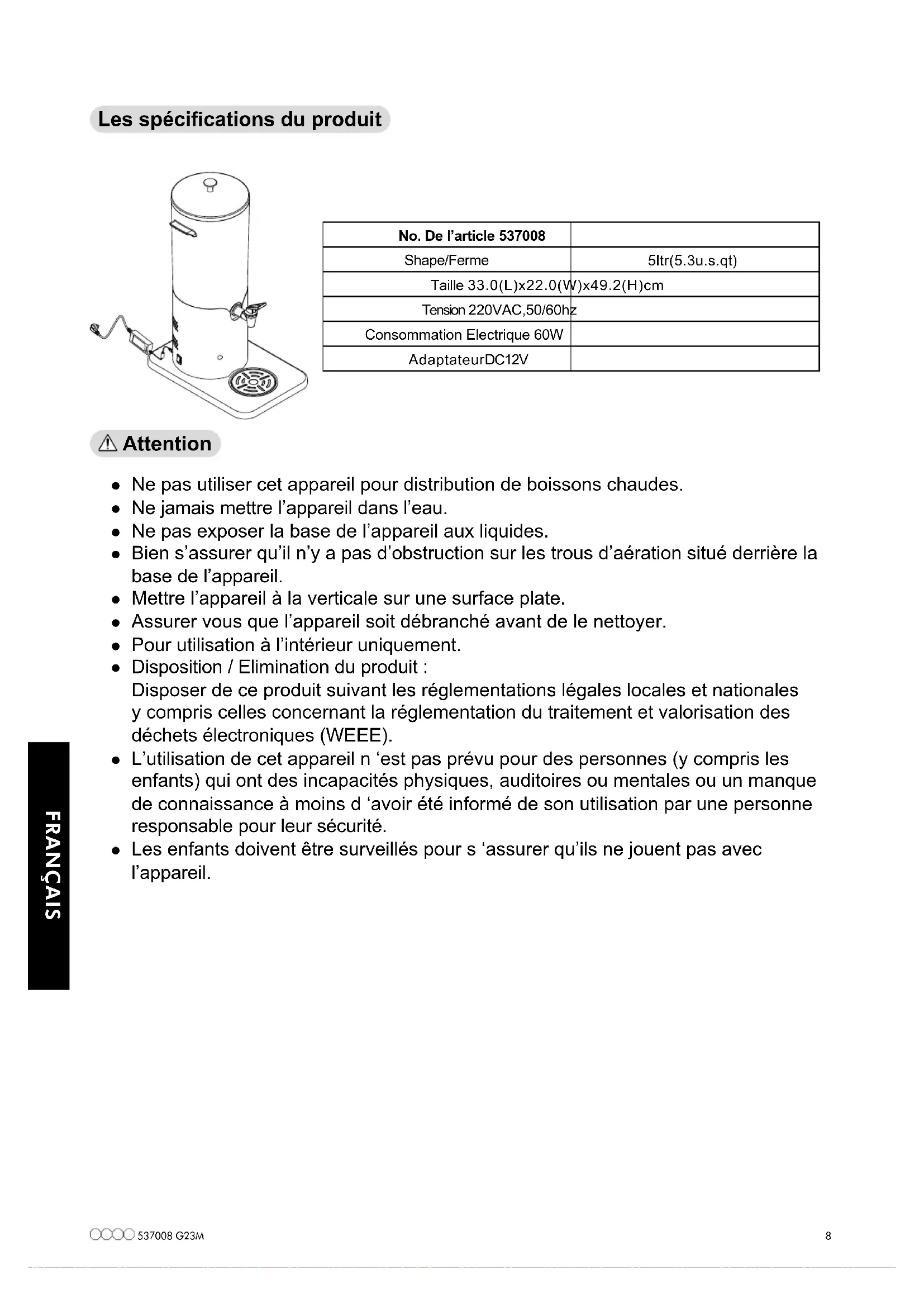 Les enfants doivent être surveillés pour s ‘assurer qu’ils ne jouent pas avec l’appareil.537008 G23M 9 FRANÇAIS Les schémas du produit Schéma 1 Adapteur Trous d'aération Dessus de la base Lumière Verte Passoire Cuvette d'égouttage Bouton on/off Couvercle Robinet Cable Électrique Récipient Comparaison entre un distributeur de boisson électrique et un distributeur de boisson traditionnel Schéma 2 17°