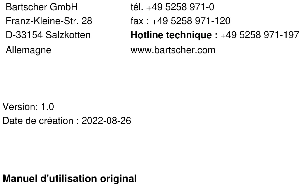 | Informations générales | Produit certifié, garantie de qualité BARTSCHER, support technique disponible pour les utilisateurs. |
