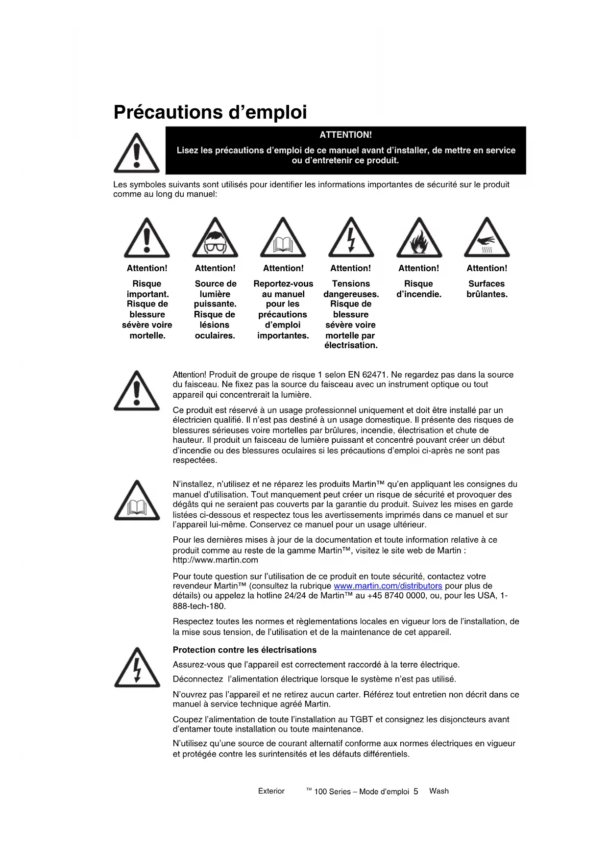 Attention! Produit de groupe de risque 1 selon EN 62471. Ne regardez pas dans la source du faisceau. Ne fixez pas la source du faisceau avec un instrument optique ou tout appareil qui concentrerait la lumière. Ce produit est réservé à un usage professionnel uniquement et doit être installé par un électricien qualifié. Il n’est pas destiné à un usage domestique. Il présente des risques de blessures sérieuses voire mortelles par brûlures, incendie, électrisation et chute de hauteur. Il produit un faisceau de lumière puissant et concentré pouvant créer un début d’incendie ou des blessures oculaires si les précautions d’emploi ci-après ne sont pas respectées. N’installez, n’utilisez et ne réparez les produits Martin™ qu’en appliquant les consignes du manuel d’utilisation. Tout manquement peut créer un risque de sécurité et provoquer des dégâts qui ne seraient pas couverts par la garantie du produit. Suivez les mises en garde listées ci-dessous et respectez tous les avertissements imprimés dans ce manuel et sur l’appareil lui-même. Conservez ce manuel pour un usage ultérieur. Pour les dernières mises à jour de la documentation et toute information relative à ce produit comme au reste de la gamme Martin™, visitez le site web de Martin : http://www.martin.com Pour toute question sur l’utilisation de ce produit en toute sécurité, contactez votre revendeur Martin™ (consultez la rubrique www.martin.com/distributors pour plus de détails) ou appelez la hotline 24/24 de Martin™ au +45 8740 0000, ou, pour les USA, 1- 888-tech-180. Respectez toutes les normes et règlementations locales en vigueur lors de l’installation, de la mise sous tension, de l’utilisation et de la maintenance de cet appareil. Protection contre les électrisations Assurez-vous que l’appareil est correctement raccordé à la terre électrique. Déconnectez l’alimentation électrique lorsque le système n’est pas utilisé. N’ouvrez pas l’appareil et ne retirez aucun carter. Référez tout entretien non décrit dans ce manuel à service technique agréé Martin. Coupez l’alimentation de toute l’installation au TGBT et consignez les disjoncteurs avant d’entamer toute installation ou toute maintenance. N’utilisez qu’une source de courant alternatif conforme aux normes électriques en vigueur et protégée contre les surintensités et les défauts différentiels.6 Exterior Wash