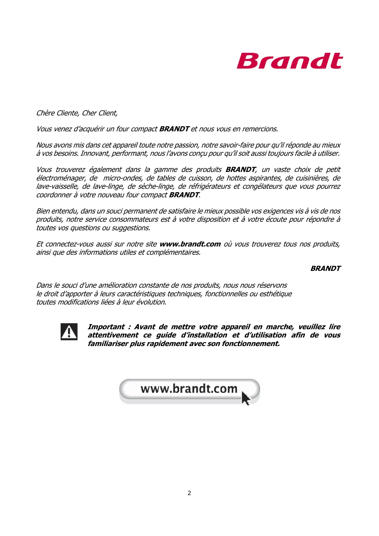 INSTRUCTION MANUAL Four compact 26L Compact oven 26L FC-26CB FC-26CW Chère Cliente, Cher Client, Vous venez d’acquérir un four compact BRANDT et nous vous en remercions. Nous avons mis dans cet appareil toute notre passion, notre savoir-faire pour qu’il réponde au mieux à vos besoins. Innovant, performant, nous l’avons conçu pour qu’il soit aussi toujours facile à utiliser. Vous trouverez également dans la gamme des produits BRANDT, un vaste choix de petit électroménager, de micro-ondes, de tables de cuisson, de hottes aspirantes, de cuisinières, de lave-vaisselle, de lave-linge, de sèche-linge, de réfrigérateurs et congélateurs que vous pourrez coordonner à votre nouveau four compact BRANDT. Bien entendu, dans un souci permanent de satisfaire le mieux possible vos exigences vis à vis de nos produits, notre service consommateurs est à votre disposition et à votre écoute pour répondre à toutes vos questions ou suggestions. Et connectez-vous aussi sur notre site www.brandt.com où vous trouverez tous nos produits, ainsi que des informations utiles et complémentaires. BRANDT Dans le souci d’une amélioration constante de nos produits, nous nous réservons le droit d’apporter à leurs caractéristiques techniques, fonctionnelles ou esthétique toutes modifications liées à leur évolution. Important : Avant de mettre votre appareil en marche, veuillez lire attentivement ce guide d’installation et d’utilisation afin de vous familiariser plus rapidement avec son fonctionnement.