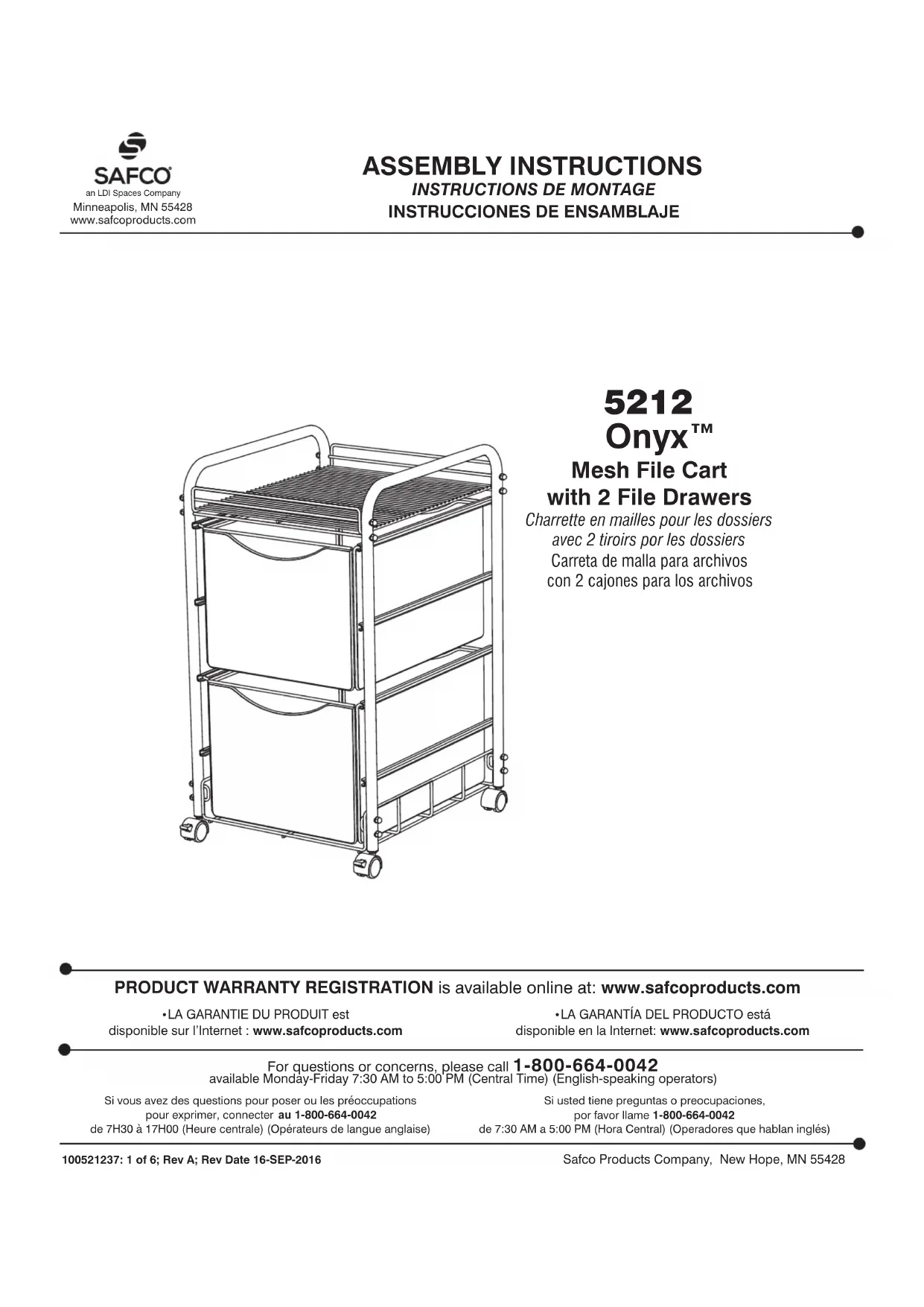 Si vous constatez qu'une pièce est manquante, veuillez contacter le service client de Safco avec votre numéro de commande et une description de la pièce manquante. Ils pourront vous aider à obtenir la pièce nécessaire.