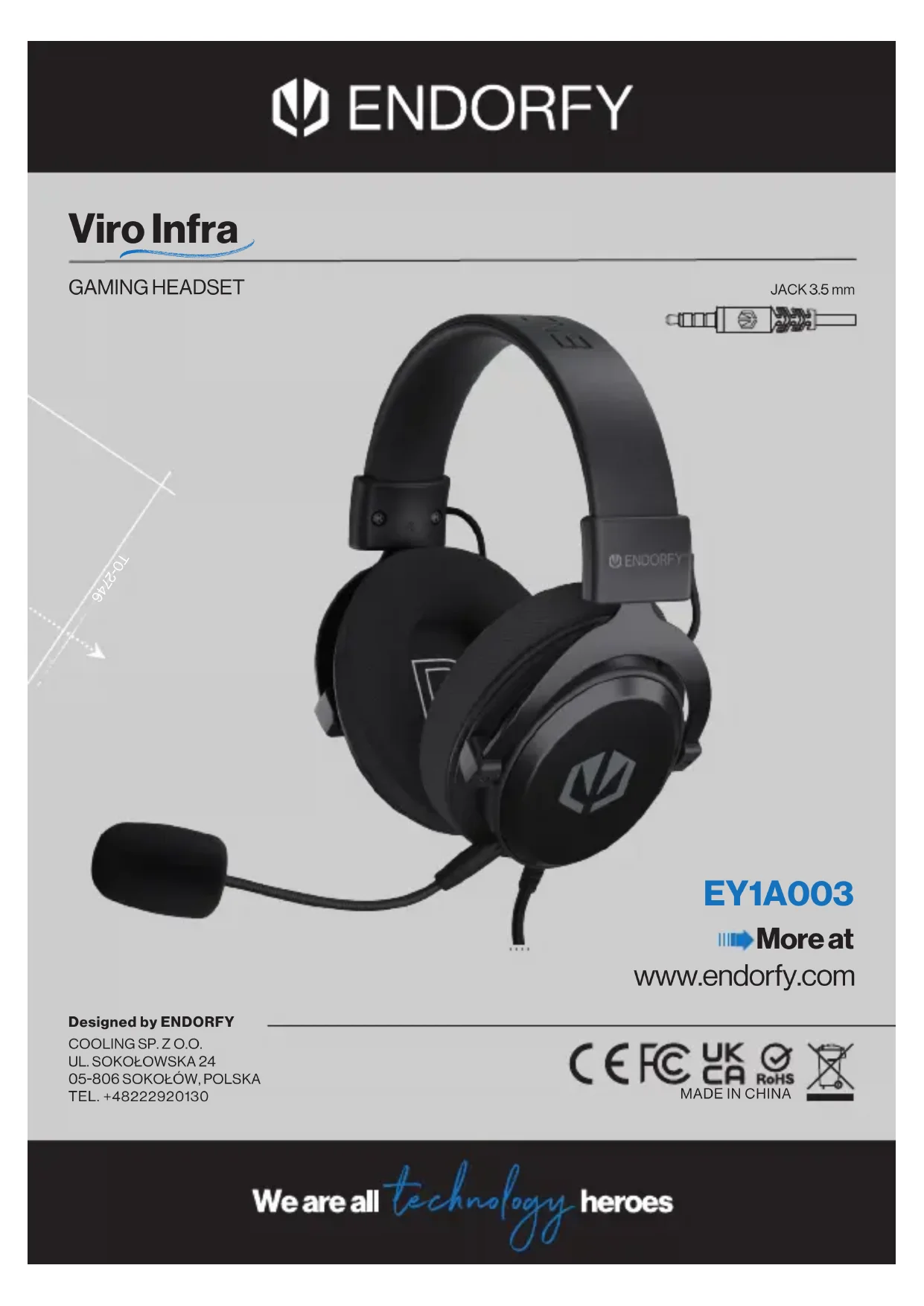 FR Consignes de sécurité Le produit doit être utilisé conformément à l'usage auquel il est destiné. Une utilisation incorrecte peut endommager le produit et présenter un risque pour la santé de l'utilisateur. Avant de l'utiliser, assurez-vous que le produit n'est pas endommagé. La garantie ne couvre pas les dommages mécaniques du produit. Cet appareil est destiné à une utilisation en intérieur, avec une humidité de l'air normale. Ne l'utilisez pas à l'extérieur. Cet appareil ne doit pas être installé et utilisé dans un endroit à la portée des enfants. Avant de brancher l'appareil, attendez qu'il atteigne la température ambiante pour éviter tout dommage dû à la condensation. Nettoyez uniquement avec un chion propre et sec. Ne touchez pas l'appareil avec les mains mouillées. L’appareil ne contient aucune pièce qui pourrait être réparée par l’utilisateur. Renvoyez l'appareil au centre de service pour réparation. L'ouverture du boîtier ou la modification de l'appareil annulera la garantie. Le produit ne doit pas être utilisé à proximité de liquides ou exposé au contact direct avec ceux-ci. En cas de contact avec des liquides, débranchez immédiatement le produit de l'alimentation électrique. En cas de dysfonctionnement, débranchez immédiatement la source d'alimentation et contactez le support technique d'ENDORFY. Les appareils électriques et électroniques ne doivent pas être jetés avec les autres déchets ménagers. L'utilisateur final est tenu de rapporter les appareils électriques usés ou non fonctionnels à un point de collecte ou à un vendeur. Pour plus d'informations, contactez vos autorités locales ou le magasin où vous avez acheté le produit. AVERTISSEMENT : Une utilisation prolongée avec un niveau sonore élevé peut endommager l'audition de l’utilisateur de façon permanente. Le niveau du volume peut varier en fonction de l'appareil, de ses l'appareil et/ou de l'environnement.