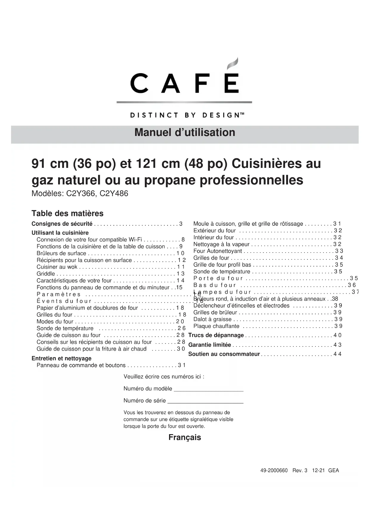 Pour optimiser le rendement, le ventilateur de convection (selon la fonction que vous utilisez) peut passer par des cycles marche-arrêt jusqu’à ce que la fonction soit terminée ou que la porte soit ouverte. Cela est normal. De plus, le ventilateur peut tourner en alternance dans le sens horaire et antihoraire jusqu’à ce que la fonction soit terminée ou que la porte soit ouverte. Les brûleurs ne s’allument pas La fiche du cordon de la cuisinière n’est pas complètement insérée dans la prise électrique. Assurez-vous que la fiche est branchée dans une prise fonctionnelle, correctement mise à la terre. L’alimentation en gaz n’est pas connectée ou mise en marche. Voyez les instructions d’installation qui accompagnent votre cuisinière. 8QIXVLEOHGHYRWUHGRPLFLOHHVWSHXWrWUHJULOOpRXOHGLVMRQFWHXUV¶HVWGpFOHQFKp5HPSODFH]OH fusible ou réenclenchez le disjoncteur. Des pièces du brûleur n’ont pas été remises en place correctement. Voyez la section Entretien et nettoyage du four. Les fentes du brûleur près de l’électrode sont peut-être obstruées. Retirez les brûleurs et nettoyez- les. Vérifiez la zone de l’électrode à l’affût d’aliments ou de graisse brûlés. Voyez la section Entretien et nettoyage du four. Résidu d’aliment sur l’électrode. Polissez légèrement le bout plat de l’électrode avec une lime à ongles ou un papier sablé jusqu’à ce qu’il soit brillant. Les brûleurs du dessus ne brûlent pas uniformément Assemblage de brûleurs incorrect. Assurez-vous que les chapeaux de brûleur sont placés correctement. Voyez la section Entretien et nettoyage du four. Des fentes sur le côté du brûleur sont peut-être obstruées. Retirez les brûleurs pour le nettoyage. Voyez la section Entretien et nettoyage du four. Les flammes des brûleurs sont très JUDQGHVHWMDXQHV Mauvaise proportion d’air par rapport au gaz. Si la cuisinière est raccordée au gaz propane, contactez le technicien qui a installé la cuisinière ou effectuez la conversion. De La Condensation Ou Du Brouillard Embue L’intérieur De La Vitre De Porte. La présence de condensation ou de brouillard sur l’intérieur de la vitre de la porte du four est normale durant le préchauffage du four et elle disparaît habituellement à la fin du cycle de préchauffage. Le four ne se met pas en autonettoyage la température du four est trop élevée pour fonctionner en mode d’autonettoyage. Laissez le four refroidir en dessous de la température .de fermeture et réglez les commandes à nouveau. Les boutons sont mal réglés. Voir la section Four en mode nettoyage automatique. Le four est sale après un programme de nettoyage le four est extrêmement sale. Nettoyez les éclaboussures coriaces avant démarrer le nettoyage. Les fours extrêmement sales devront probablement êtr à nouveau nettoyés. Le four est branché sur une alimentation 208 V. Réglez le temps de nettoyage sur 5 heures. Les boutons sont mal réglés. Voir la section Four en mode nettoyage automatique. Les grilles du four sont difficiles à coulisser les grilles doivent être nettoyées dans le programme d’autonettoyage et régulièrement lubrifiées. Ne pulvérisez pas de produit pour cuisine ou autres lubrifiants. Voir Grilles de four extensibles dans la section Entretien et nettoyage. Le minuteur ne marche pas vous ne pouvez pas utiliser le minuteur si le four est en mode nettoyage automatique. Message « Err turn surface burners off » (Erreur, éteindre les brûleurs de surface) sur l’écran l’autonettoyage est en cours et la fonction de verrouillage de la table de cuisson est activée. Aucune cuisson de surface n’est autorisée durant l’autonettoyage. Attendez que cette opération soit terminée. Message « Close door » (Fermer la porte) sur l’écran le programme de nettoyage automatique a été sélectionné mais la porte n’est pas fermée. Fermez la porte du four. Le symbole apparaîtra sur l’écran.42 49-2000660 Rev. 3 Notes49-2000660 Rev. 3 43 Garantie limitée Brochez votre reçu ici. Pour obtenir le service sous ga- rantie, vous devrez fournir la preuve de l’achat original. ElectromenegersGE.ca Toute réparation en vertu de la garantie est réalisée dans nos Centres de réparation en usine, ou par un technicien en réparation autorisé. Pour fixer un rendez-vous en ligne, consultez notre site ElectromenegersGE.ca/fr/soutien/ demande-de-service. Veuillez avoir votre numéro de série et votre numéro de modèle à portée de la main lors d’un appel de service. L’entretien de votre appareil pourrait nécessiter l’utilisation d’un accès aux données embarquées pour le diagnostic. Cela permet au technicien de l’atelier de réparation CAFÉ de diagnostiquer rapidement toute défaillance de votre électroménager et à CAFÉ d’améliorer la qualité de ses produits. Si vous ne souhaitez pas transmettre les données de votre appareil à CAFÉ, veuillez aviser votre technicien de s’en abstenir au moment de la visite de service. Ce qui n’est pas couvert par CAFÉ : Ŷ/HVGpSODFHPHQWVGHVWHFKQLFLHQVjYRWUHGRPLFLOHSRXUYRXV apprendre à utiliser l’appareil. Ŷ'pFRORUDWLRQGHODSODTXHFKDXIIDQWHRXGHVJULOOHVGXIRXU Ŷ&DVVXUHGHVJULOOHVSRUFHODLQHpPDLOOpHRXGHVJULOOHVGXIRXU Ŷ5HPSODFHPHQWGHVIXVLEOHVRXUpHQFOHQFKHPHQWGHV disjoncteurs. Ŷ'RPPDJHVLQGLUHFWVOLpVDX[pYHQWXHOVG\VIRQFWLRQQHPHQWV de cet appareil. Ŷ'RPPDJHVOLpVDXWUDQVSRUW Ŷ'RPPDJHVOLpVjXQDFFLGHQWLQFHQGLHLQRQGDWLRQV catastrophes naturelles. Ŷ'pIDLOODQFHRXGRPPDJHGXSURGXLWV¶LOHVWPDOWUDLWpPDO utilisé, utilisé à d’autres fins que l’usage prévu, ou utilisé commercialement. Ŷ,QVWDOODWLRQOLYUDLVRQHWHQWUHWLHQLQDSSURSULpV Si vous rencontrez une problème d’installation, contactez votre revendeur ou installateur. Il vous incombe de fournir une alimentation de gaz, électrique, une ventilation adéquats et autres raccordements comme indiqué dans les consignes d’installation fournies avec l’appareil. Ŷ/¶DSSDUHLOQ