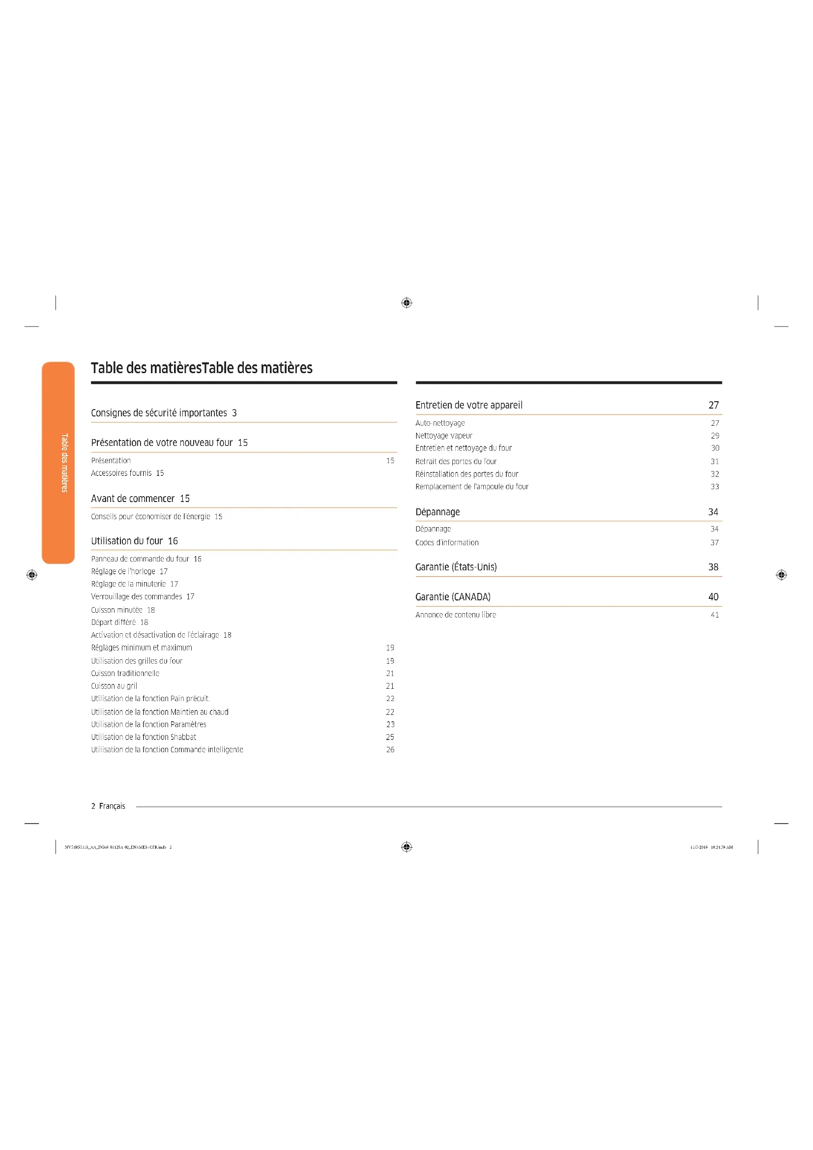 - Reportez-vous au chapitre relatif à l'auto-nettoyage, en page 27. NV51R5511S_AA_DG68-01125A-02_EN+MES+CFR.indb 36 11/5/2019 10:25:05 AMFrançais 37 Dépannage Problème Cause possible Solution Odeur forte. Il est normal de constater une odeur provenant de l'isolation de la cavité du four lors des premières utilisations de votre four. Faites fonctionner à vide le four en mode Cuisson traditionnelle sur 400 °F pendant 1 heure. Vous avez des difcultés à faire glisser les grilles du four. Les grilles, brillantes et de couleur argentée, ont été nettoyées au cours d'un cycle d'auto-nettoyage. À l'aide de papier absorbant imbibé d'huile végétale, essuyez les bords des grilles du four. La porte du four est verrouillée. Le disjoncteur s'est déclenché ou une coupure de courant est survenue alors que la porte du four était verrouillée. Activez la fonction Verrouillage des commandes, puis déverrouillez la commande. Reportez-vous à la section Verrouillage des commandes en page 17. Codes d'information FOUR Code afché Cause possible Solution C-d0 Ce code apparaît si la touche Contrôle est court-circuitée pendant 1 minute. Nettoyez les boutons et assurez-vous qu'il n'y a pas d'eau autour d'eux. Éteignez le four et réessayez. Si le problème persiste, prenez contact avec un centre de dépannage Samsung local. C-d1 Ce code apparaît si le verrouillage de la porte est mal positionné. Appuyez sur OVEN OFF (ARRÊT DU FOUR) et redémarrez le four. Si le problème persiste, coupez toute l'alimentation du four pendant au moins 30 secondes puis rétablissez- la. Si le problème n'est pas résolu, contactez le service technique. C-F0 Ce code apparaît si la communication entre la carte de circuit imprimé principale et la carte de circuit imprimé secondaire est interrompue. C-F2 Ce code apparaît si la communication entre la carte de circuit imprimé principale et la carte de circuit imprimé des commandes tactiles est interrompue. C-20 Le capteur du four est ouvert lorsque le four est utilisé. Le capteur du four est court-circuité lorsque le four est utilisé. NV51R5511S_AA_DG68-01125A-02_EN+MES+CFR.indb 37 11/5/2019 10:25:05 AM38 Français Garantie Garantie Code afché Cause possible Solution C-21 Ce code apparaît si la température interne augmente à un niveau anormalement élevé. Appuyez sur OVEN OFF (ARRÊT DU FOUR) et redémarrez le four. Si le problème persiste, coupez toute l'alimentation du four pendant au moins 30 secondes puis rétablissez- la. Si le problème n'est pas résolu, contactez le service technique. C-30 Le capteur de la carte de circuit imprimé est ouvert lorsque le four est utilisé. Le capteur de la carte de circuit imprimé est court-circuité lorsque le four est utilisé. C-31 Ce code apparaît si la température de la carte de circuit imprimé augmente à un niveau anormalement élevé. Contactez le service technique. C-A2 Le moteur de refroidissement fonctionne anormalement. Contactez le service technique. bAd LinE Ce code s'afche lorsque l'alimentation électrique est interrompue de manière impromptue. Rebranchez correctement les ls d'alimentation ; le message disparaît alors. Garantie (États-Unis) VEUILLEZ NE PAS JETER. CETTE PAGE REMPLACE LA PAGE DE GARANTIE CONTENUE DANS LE GUIDE D’UTILISATION ET D’ENTRETIEN.