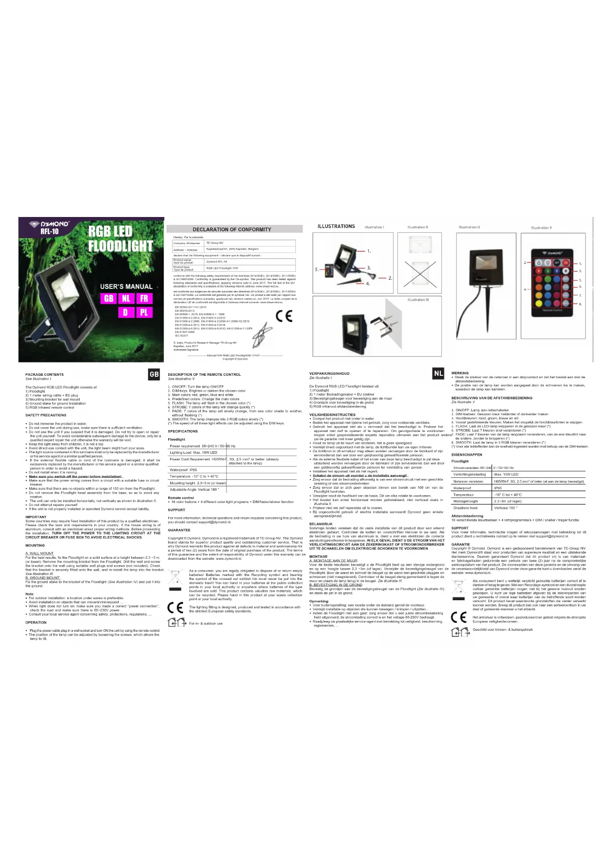 Pour plus d’informations, des questions techniques ou des demandes de retour concernant ce produit, il faut contacter support@dymond.nl. GARANTIE Copyright © Dymond. Dymond est une marque déposée de TE-Group NV. La marque de Dymond est synonyme de produits de qualité supérieure et d’un service après- vente excellent. C’est la raison pour laquelle Dymond garantit ce produit contre tout défaut de matériel ou de fabrication pour une période de deux (2) ans à compter de la date d’achat initiale. Pour connaître les conditions générales de cette garantie et l’étendue des responsabilités de Dymond au titre de cette garantie, consultez notre site web www.dymond.nl. En tant que consommateur la loi vous oblige à éliminer correctement les batteries usées, ou de les rapporter au vendeur ! Les batteries munies du label de recyclage et de la poubelle barrée ne doivent jamais être jetées dans les ordures ménagères ! Vous pouvez apporter les batteries dans les emplacements de collecte de votre commune ou bien partout où l’on vend les batteries de ce type. Ce produit contient des matières premières précieuses qui sont susceptibles d’être recyclées. Veuillez le remettre pour ces raisons à votre centre de collecte municipal ou régional. L’appareil d’éclairage est conçu, fabriqué et testé en conformité avec les normes de sécurité européennes les plus strictes. Pour usage à l’intérieur et extérieur LIEFERUMFANG Siehe Abb. I Ihr Dymond RGB LED Floodlight besteht aus: