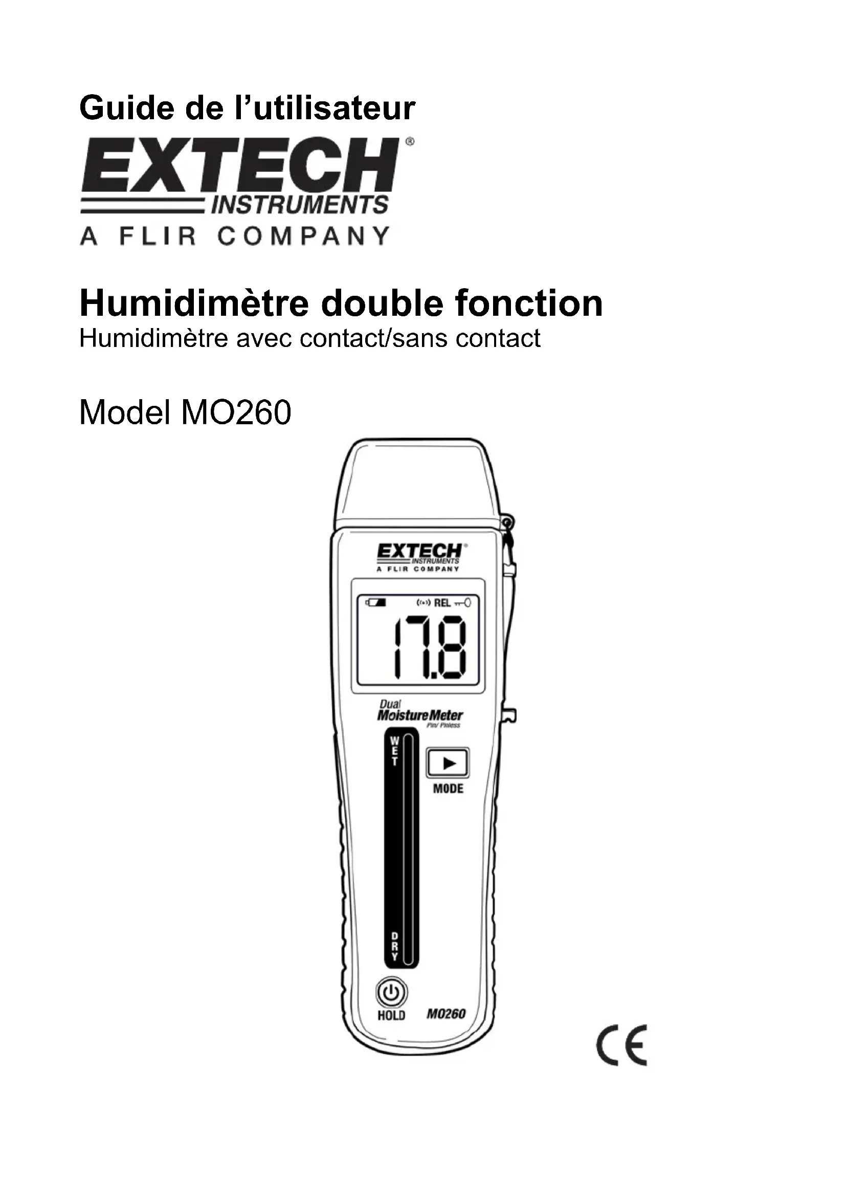 Introduction Toutes nos félicitations pour votre acquisition de l’humidimètre Extech MO260. Le MO260 détecte l'humidité dans le bois et d'autres matériaux tels que les panneaux de particules, la moquette, les carreaux de plafond/salle de bains à l’aide de la méthode non invasive (sans contact) ; le MO260 mesure également l’humidité de les plaques de plâtre et d’autres matériaux de construction à l’aide de la méthode avec contact. This meter is shipped fully tested and calibrated and, with proper use, will provide years of reliable service. Features Lecture avec contact du % d’HBE (humidité du bois équivalente) Lecture sans contact d’humidité relative (REL) pour une mesure non invasive Affichage LCD numérique avec fonction de rétro-éclairage et de graphique à barres tricolore Indique rapidement le teneur en humidité de matériaux Profondeur de mesures sans contact atteignant 22 mm (0,75 po) sous la surface Technologie de détection électromagnétique pour une utilisation sans contact Vérification intégrée du calibrage et du calibrage zéro Broches d’électrode de mesure remplaçables Icône de pile faible Le couvercle protège les broches pendant le rangement Le couvercle peut être placé contre la face latérale du boîtier pendant l'utilisation Livré avec pile 9 V, broches de rechange, couvercle de protection et étui de transport.MO260-EU-FR-V1.3 5/12