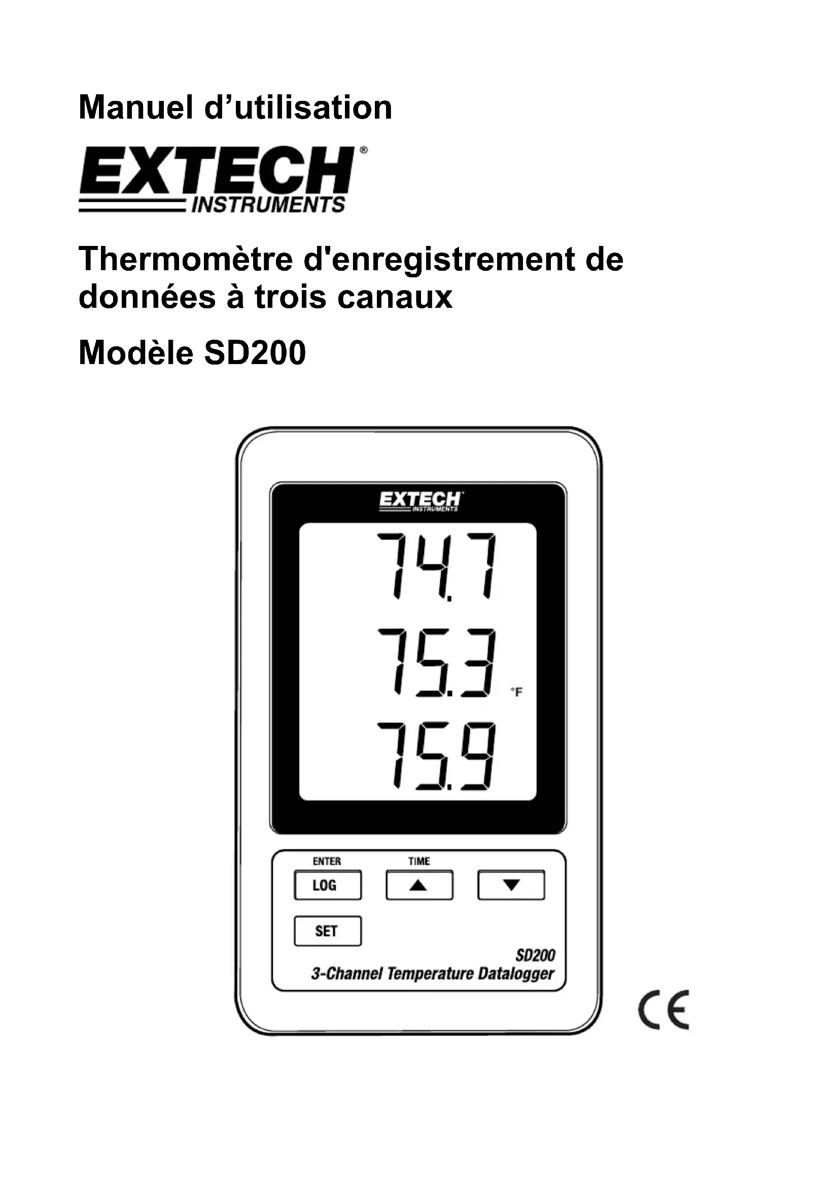 Introduction Toutes nos félicitations pour votre acquisition de l’enregistreur de données de température à trois canaux Extech SD200 Cet appareil affiche et enregistre les données de température sur une à trois sondes de température thermocouple de type k. Les données sont enregistrées sur une carte SD et transférées vers un PC. Cet appareil est livré entièrement testé et calibré et, sous réserve d’une utilisation adéquate, vous fera bénéficier de nombreuses années de service fiable. Caractéristiques Ecran LCD triple affichage permettant d’afficher simultanément 3 canaux de température de type K. L’enregistreur de données horodate et enregistre les lectures sur une carte SD au format Excel® pour permettre leur transfert en toute facilité vers un PC. Vitesse de prise de mesure réglable : 5, 10, 30, 60, 120, 300, 600 secondes. Pile longue durée ou adaptateur de courant AC. - Gamme de température de -50 à 1300 °C /-58 à 2372 °F avec une résolution de 0,1 °F/°C.SD200-EU-FR-V1.8 07/13