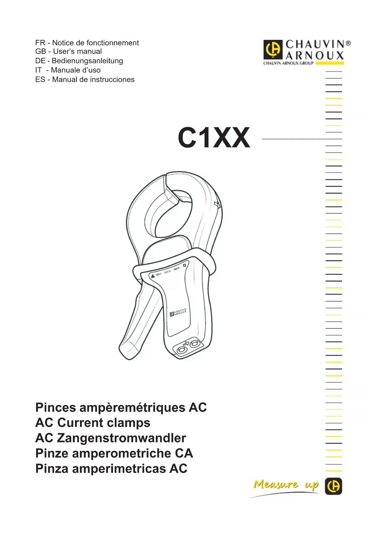 - Pinces ampèremétriques AC AC Current clamps AC Zangenstromwandler Pinze amperometriche CA Pinza amperimetricas AC FR - Notice de fonctionnement GB - User’s manual DE - Bedienungsanleitung IT - Manuale d’uso ES - Manual de instrucciones C1XX2 English p. 9