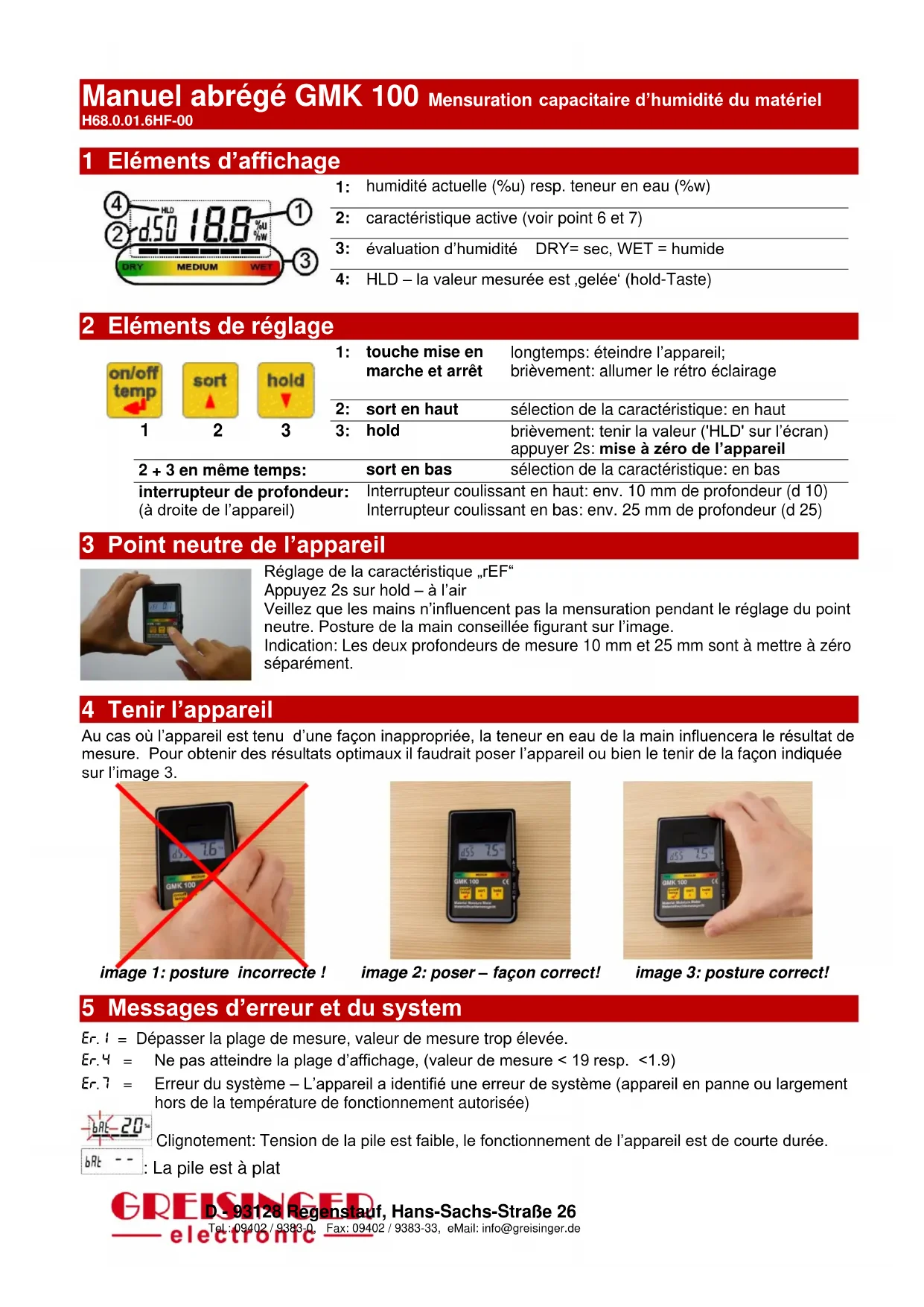 image 1: posture incorrecte ! image 2: poser – façon correct! image 3: posture correct! 5 Messages d’erreur et du system ER. 1 = Dépasser la plage de mesure, valeur de mesure trop élevée. ER. 4 = Ne pas atteindre la plage d’affichage, (valeur de mesure < 19 resp. <1.9) ER. 7 = Erreur du système – L’appareil a identifié une erreur de système (appareil en panne ou largement hors de la température de fonctionnement autorisée) Clignotement: Tension de la pile est faible, le fonctionnement de l’appareil est de courte durée. : La pile est à platD - 93128 Regenstauf, Hans-Sachs-Straße 26 Tel.: 09402 / 9383-0, Fax: 09402 / 9383-33, eMail: info@greisinger.de