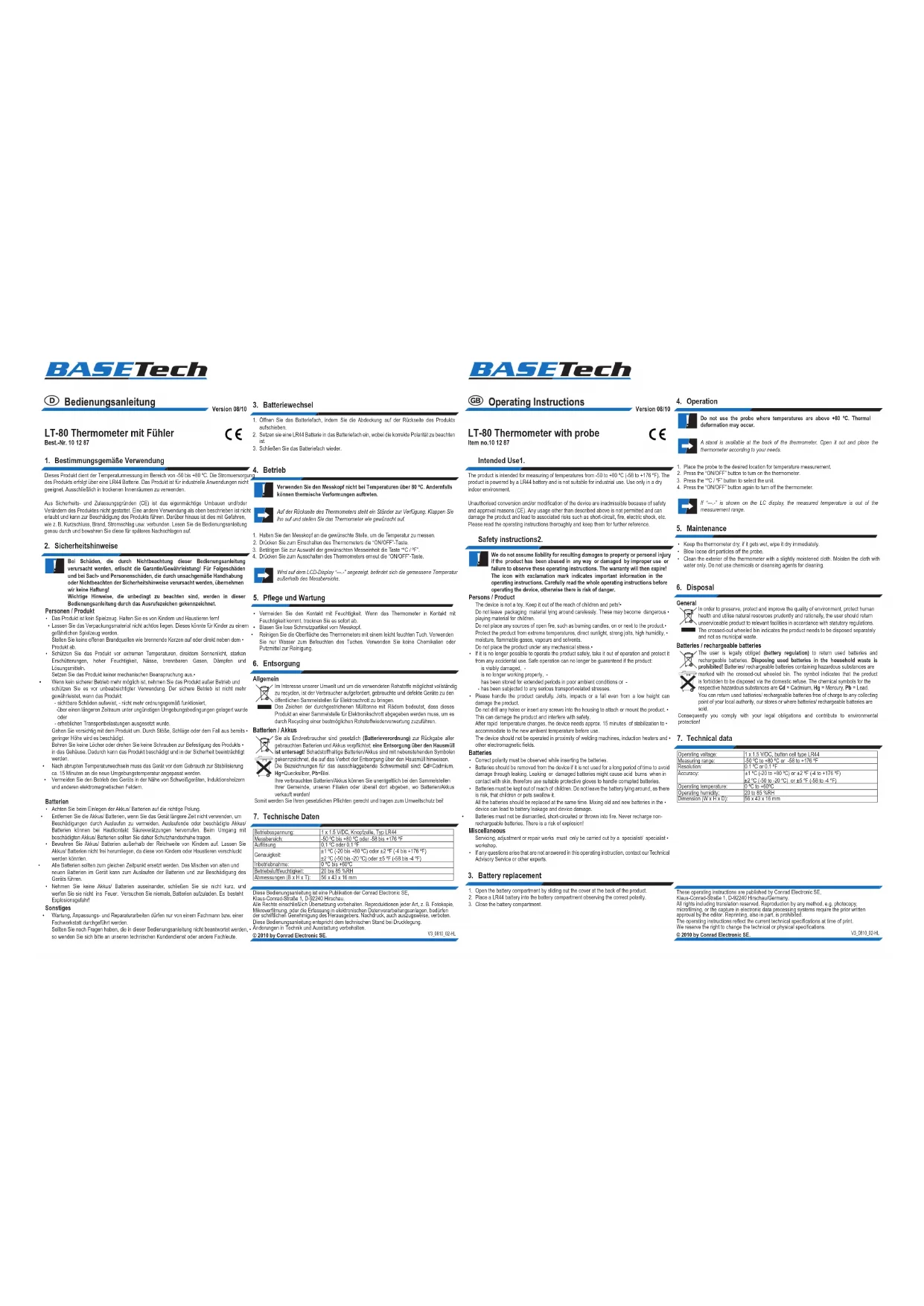 Caractéristiques techniques7. Tension de service : 1 x 1.5 V/DC, pile bouàn de type LR44 Gamme de mesure : -50 ºC à +80 ºC ou -58 à +176 ºF Résolution : 0,1 ºC ou 0,1 ºF Précision : ±1 ºC (-20 à +80 ºC) ou ±2 ºF (-4 à +176 ºF) ±2 ºC (-50 à -20 ºC) ou ±5 ºF (-58 à -4 ºF) Température de service : 0 ºC à +60ºC Humidité de fonctionnement : 20 à 85 %RH Dimensions (L x H x P): 56 x 43 x 16 mm Cette notice est une publication de la société Conrad Electronic SE, Klaus-Conrad-Straße 1, D-92240 Hirschau/Allemagne. Tous droits réservés, y compris de traduction. Toute reproduction, quelle qu’elle soit (p. ex. photocopie, microlm, saisie dans des installations de traitement de données) nécessite une autorisation écrite de l’éditeur. Il est interdit de le réimprimer, même par extraits. Cette notice est conforme à la réglementation en vigueur lors de l´impression. Données techniques et conditionnement soumis à modications sans aucun préalable. © 2010 par Conrad Electronic SE. V3_0810_02-HL Deze gebruiksaanwijzing is een publicatie van Conrad Electronic SE, Klaus-Conrad-Straße 1, D-92240 Hirschau/Duitsland. Alle rechten, vertaling inbegrepen, voorbehouden. Reproducties van welke aard dan ook, bijvoorbeeld fotokopie, microverlming of de registratie in elektronische gegevensverwerkingsapparatuur, vereisen de schriftelijke toestemming van de uitgever. Nadruk, ook van uittreksels, verboden. Deze gebruiksaanwijzing voldoet aan de technische eisen bij het ter perse gaan. Wijzigingen in techniek en uitrusting voorbehouden. © 2010 bei Conrad Electronic SE. V3_0810_02-HL