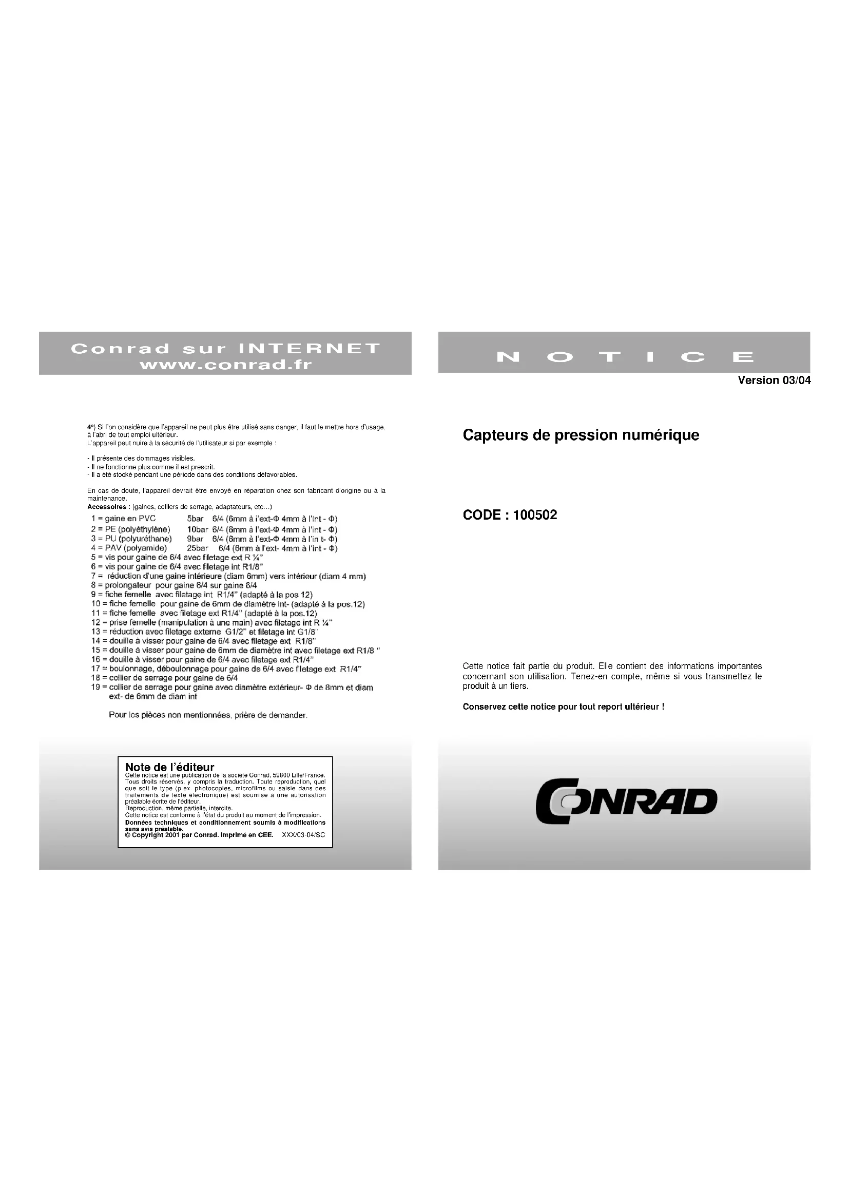 4°) Si l’on considère que l’appareil ne peut plus être utilisé sans danger, il faut le mettre hors d’usage, à l’abri de tout emploi ultérieur. L’appareil peut nuire à la sécurité de l’utilisateur si par exemple : - Il présente des dommages visibles. - Il ne fonctionne plus comme il est prescrit. - Il a été stocké pendant une période dans des conditions défavorables. En cas de doute, l’appareil devrait être envoyé en réparation chez son fabricant d’origine ou à la maintenance. Accessoires : (gaines, colliers de serrage, adaptateurs, etc…) Note de l’éditeur Cette notice est une publication de la société Conrad, 59800 Lille/France. Tous droits réservés, y compris la traduction. Toute reproduction, quel que soit le type (p.ex. photocopies, microfilms ou saisie dans des traitements de texte électronique) est soumise à une autorisation préalable écrite de l’éditeur.Reproduction, même partielle, interdite. Cette notice est conforme à l’état du produit au moment de l’impression. Données techniques et conditionnement soumis à modifications sans avis préalable. © Copyright 2001 par Conrad. Imprimé en CEE. XXX/03-04/SC Capteurs de pression numérique CODE : 100502 Cette notice fait partie du produit. Elle contient des informations importantes concernant son utilisation. Tenez-en compte, même si vous transmettez le produit à un tiers. Conservez cette notice pour tout report ultérieur ! NOTICE Conrad sur INTERNET www.conrad.fr Version 03/04GMSD…R, GMSD…A Caractéristiques techniques (GMSD…R) Capteur : Capteur de pression piezorésistif. Pour la pression de l’air (baromètre), vacuum, pression absolue. Approprié pour l’air, et pour les gaz et liquides non corrosifs et non ionisants. Le capteur ne peut être utilisé qu’en employant un collecteur d’air. Caractéristiques techniques (GMSD…A) : Exactitude : (type de valeurs) +/- 0,2% (hystérère et linéarité) +/- 0,2% (Variantion de température de 0 -50°C) Option : précision supérieure : +/- 0,2% (hystérère et linéarité) ; +/- 0,2% (Variantion de température de 0 -50°C) Capteur : Pression absolue du capteur piezorésistif. Pour la pression de l’air (baromètre), vacuum, pression absolue. Approprié pour l’air, et pour les gaz et liquides non corrosifs et non ionisants. Caractéristiques techniques (GMSD…R, GMSD…A) : Connexion : 2 pour raccordement de tuyaux de 6 x 1 mm (6mm à l’extérieur _ et 4 mm à l’intérieur). Electronique : Platine avec amplificateur et mémoire pour les caractéristiques du capteur (échelle, calibration, etc…).Elle est intégrée au boîtier du capteur. Température nominale : 25°C Température de travail : 0 à +50°C Humidité relative : 0 à 95% (sans condensation) Température de stockage : -40 à + 85 °C Coffret : 68 x 32.5 x 15 mm (L x B x D) sans charnière d’assemblage. Coffret en ABS avec étriers de suspension. Raccordement : 1 mètre de câble blindé en PVC avec connecteur mini DIN à 6 pôles à verrou de sûreté. Env 75 g Résistance électromagnétique : Les GMSD…. correspondent aux exigences de protection essentielles, qui sont fixées dans les normes en vigueur du Conseil, pour ajuster les dispositions législatives concernant la comptabilité électromagnétique. (89/336/EWG). Erreurs supplémentaires : <1%. Consignes d’utilisation : a) Appareil et capteur doivent être utilisés avec soin, et manipulés conformément aux données techniques citées ci-dessus. (ne pas jeter, heurter, etc..). Fiches mâle et femelle doivent être protégés des risques d’encrassement. b) Lorsque vous débranchez le capteur de pression, il ne faut pas tirer sur le câble, mais au contraire sur la fiche mâle (il se produit alors un déverrouillage). Lorsque vous le branchez, veillez à ce que la flèche soit orientée vers le haut et que la prise mâle soit introduite au centre de la douille de raccordement. Ne pas brancher de biais mais dans l’alignement. Lorsque la prise mâle est correctement fixée, il peut fonctionner sans dépense d’énergie supplémentaire. Si la fiche est volontairement mal branchée, alors les broches de connexion peuvent se plier ou se casser.‡‡ La fiche est alors inutilisable et le câble de connexion doit être remplacé. c) Schéma de connexion pour le raccord de tuyau du capteur. En cas de mesure de surpression : (capteur de pression relative) : - Brancher la gaine plastifiée de 4 mm de diamètre au raccord d’appareil " B ". Le raccord " A " reste libre. En cas de mesures de pression différentielles : (capteur de pression relative) - Brancher les 2 gaines plastifiées de 4 mm de diamètre intérieur aux raccords de l’appareil, le branchement du raccord " B ", en veillant que la borne de connexion à plus forte pression soit branchée sur " B ". Pour les mesures de pression : (capteur de pression absolu) - Brancher la gaine plastifiée de 4 mm de diamètre à la borne de connexion " A ". La borne de connexion " B " reste libre. Consignes de sécurité : Cet appareil est fabriqué et testé conformément aux normes de sécurité imposées pour les appareils électroniques. Si les mesures de sécurité usuelles et spécifiques à un appareil sont respectées (voir mode d’emploi), il peut alors être utilisé. Uniquement après en avoir vérifié sa fiabilité et sa fonction, celui-ci est considéré comme parfait. 1°) Le parfait fonctionnement d’un appareil et sa fiabilité ne sont garantis que s’ils sont spécifiés dans le chapitre " caractéristiques techniques ". 2°) Si l’appareil est transporté d’un endroit froid à un endroit chaud, il peut se produire de la condensation qui peut entraver le bon fonctionnement de l’appareil. Dan ce cas, il est conseillé d’équilibrer la température de l’appareil à la température ambiante avant de le réutiliser. 3°) Soyez particulièrement vigilants lorsque vous branchez vos appareils à d’autres apparei