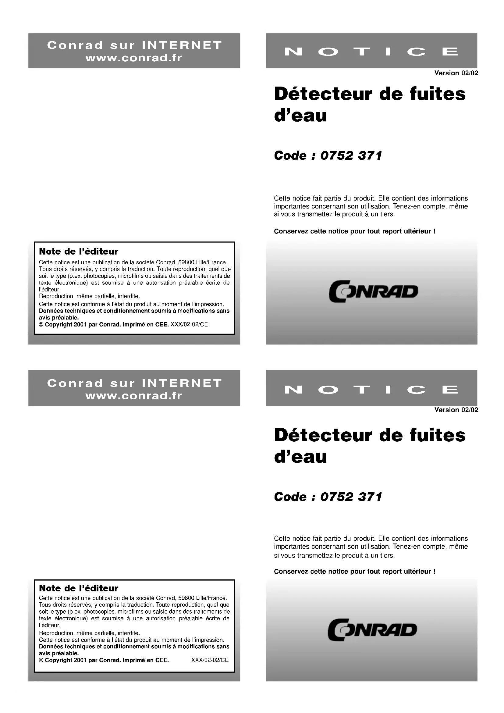 Note de l’éditeur Cette notice est une publication de la société Conrad, 59800 Lille/France.Tous droits réservés, y compris la traduction. Toute reproduction, quel quesoit le type (p.ex. photocopies, microfilms ou saisie dans des traitements detexte électronique) est soumise à une autorisation préalable écrite del’éditeur.Reproduction, même partielle, interdite.Cette notice est conforme à l’état du produit au moment de l’impression.Données techniques et conditionnement soumis à modifications sansavis préalable.© Copyright 2001 par Conrad. Imprimé en CEE. XXX/02-02/CE Conrad sur INTERNET www.conrad.fr NOTICE Note de l’éditeur Cette notice est une publication de la société Conrad, 59800 Lille/France. Tous droits réservés, y compris la traduction. Toute reproduction, quel que soit le type (p.ex. photocopies, microfilms ou saisie dans des traitements de texte électronique) est soumise à une autorisation préalable écrite de l’éditeur.Reproduction, même partielle, interdite. Cette notice est conforme à l’état du produit au moment de l’impression. Données techniques et conditionnement soumis à modifications sans avis préalable. © Copyright 2001 par Conrad. Imprimé en CEE. XXX/02-02/CE Conrad sur INTERNET www.conrad.fr NOTICE Version 02/02Version 02/02 Détecteur de fuites d’eau Code : 0752 371 Cette notice fait partie du produit. Elle contient des informations importantes concernant son utilisation. Tenez-en compte, même si vous transmettez le produit à un tiers.Conservez cette notice pour tout report ultérieur ! Détecteur de fuites d’eau Code : 0752 371 Cette notice fait partie du produit. Elle contient des informations importantes concernant son utilisation. Tenez-en compte, même si vous transmettez le produit à un tiers.Conservez cette notice pour tout report ultérieur !2